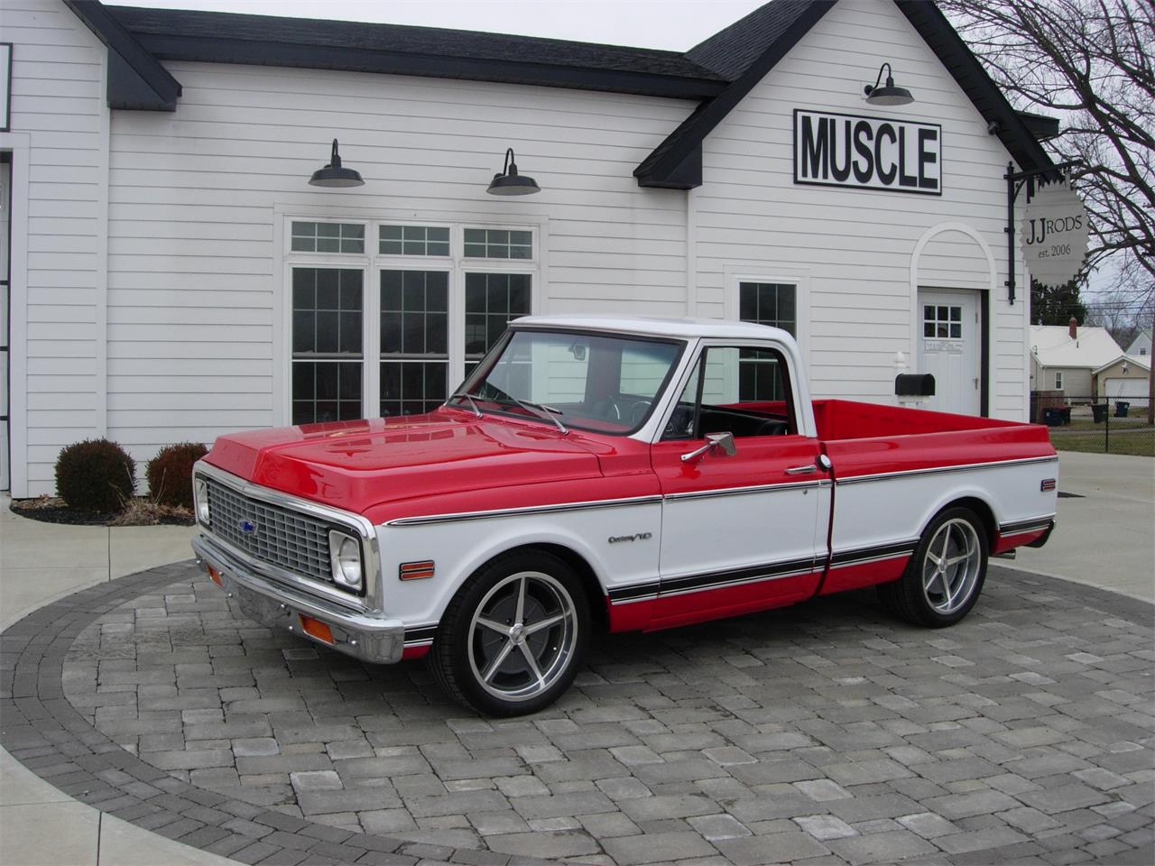 Restored in two tone Red and White base clear coat paint with all new body trim. Powered by an upgraded 5.3 liter LS engine and mated to a 4L60E automatic overdrive transmission. Driving is made easy with power steering and power disc brakes. Flow master exhaust gives that just right sound to this factory short bed pickup. The stance comes from CPP dropped spindles and springs. Interior features a custom factory look Black with Hound stooth Black and White inserts with built in cup holders. New factory door panels and custom billet steering wheel.