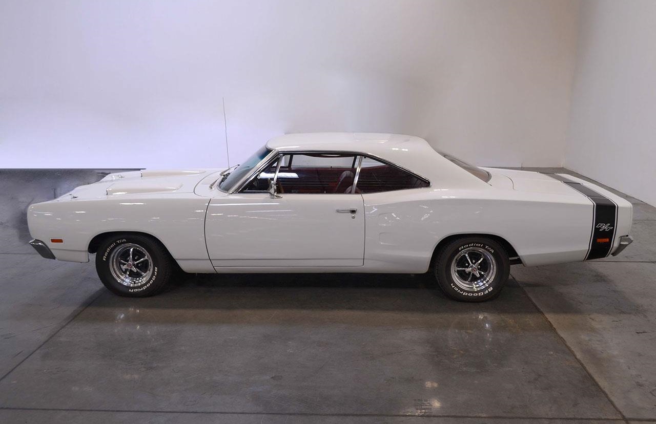 This sweet muscle car is sporting white with black stripes and a red vinyl interior.
