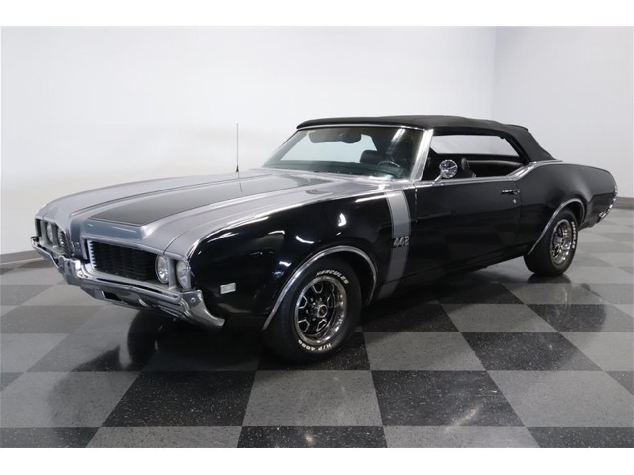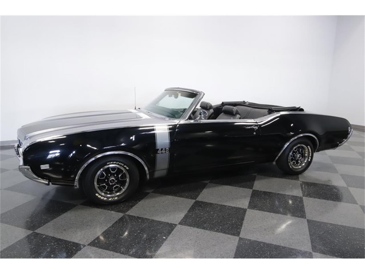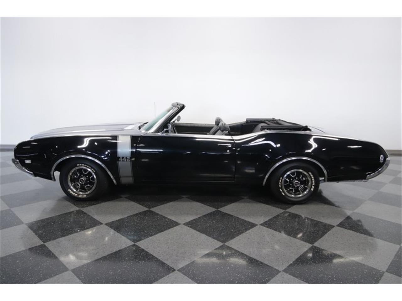 1969 Oldsmobile 442 Convertible numbers-matching 400 cubic-inch V8. The whole engine bay is nicely detailed, right down to the fresh-looking GM factory hose with correct clamp. And while this is a thoughtfully stock package, there are some sublet upgrades. This includes an Edelbrock four-barrel carburetor that lets this mighty V8 inhale deeper. Plus, with the stout TH400 three-speed automatic transmission, power steering, power brakes with discs up front, and rear sway bar. Black and silver are a timeless color combo, and this one uses the style of the car to expertly intertwine the two. For example, the 1969 cars have full-length trim that run over the body to connect the front and rear bumpers. The black stripes on the silver hood draw added attention to the dual power bulges, and the proper 442 fender triple stripe looks great in sliver. Full black interior. The textured bucket seats, door panels, and carpeting all have the clean look of quality.
