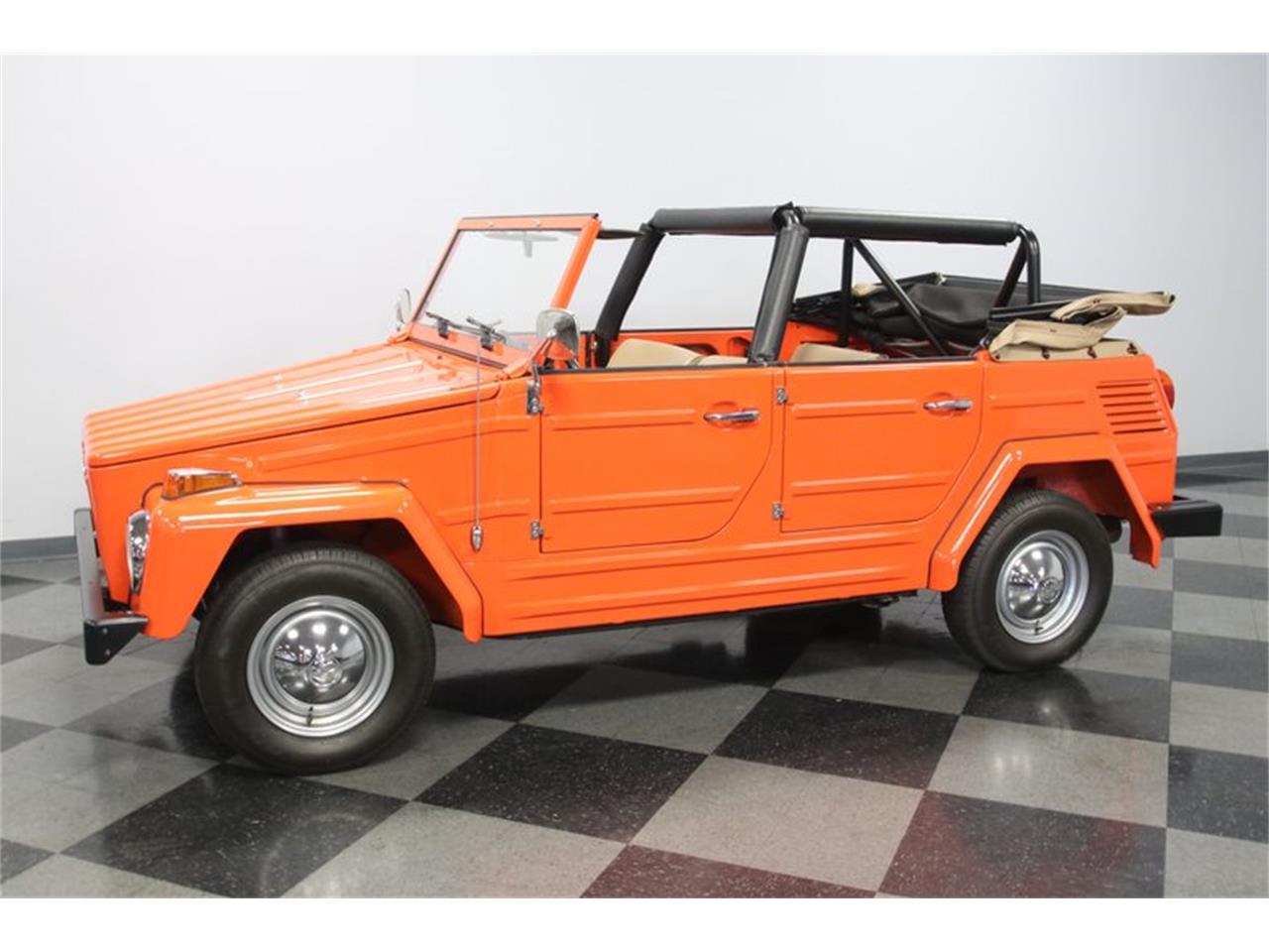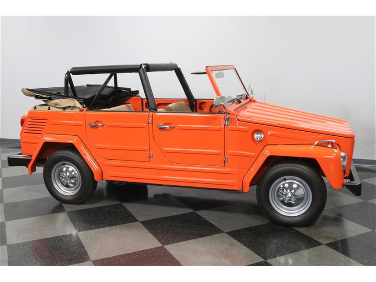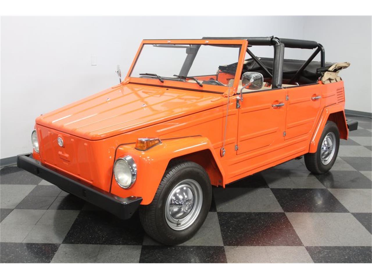 1973 Volkswagen Thing. 1600cc motor is a robust powerplant that will be easy to keep in top condition for years to come. The tan folding roof has a high-quality look to it, and that's part of this car's secret charm. The whole interior was done with the same care and thoughtfulness as the exterior, and you especially see that in the upgrades. For example, the upgraded steering wheel has a terrific grip and there's even the VW logo stamped in the center spoke. The wood overlay on the floor really reminds you this is a truly cool beach machine. The black roll bar adds safety while nicely coordinating with the black exterior accents. There are familiar pieces that remind you of the VW family like the four-speed gearshift and VDO gauge.