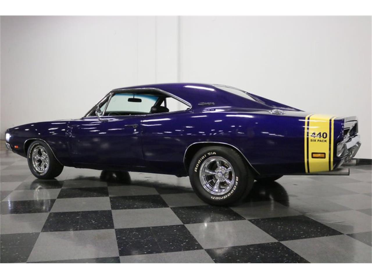 Cool 1969 details include the little rectangle side marker lights and the new rectangle taillights that inspired the Mopars of today, not to mention the divided grille and hidden headlights, which snap open when you hit the switch. The flying roofline wasn't aerodynamic enough for NASCAR but looks like a million bucks on the street and is one of the Charger's finest features. Nice chrome bumpers, a contrasting yellow rear Bumble Bee 440 Six Pack stripe, and R/T badges round out a car that's built to cruise and collect pink slips, not for a trailer. nstalled in 2003, that's a thumping 440 cubic inch V8 Six Pack under the hood, built for combat and ready to rock. It's nicely detailed and has been upgraded with Holley carburetors, Edelbrock aluminum heads, an Edelbrock Performer intake manifold, HEI ignition system, and a set of long-tube headers. With a solid wall of big block torque behind you, this car always feels fast and throttle response is crisp. The A727 Torqueflight automatic transmission feels robust as you bang through the gears and the tough rear end doesn't seem to mind spinning the tires now and then. The suspension looks to have been lowered slightly which gives it an awesome rake and it's a look to match the soundtrack from the Flowmaster H-pipe dual exhaust system.