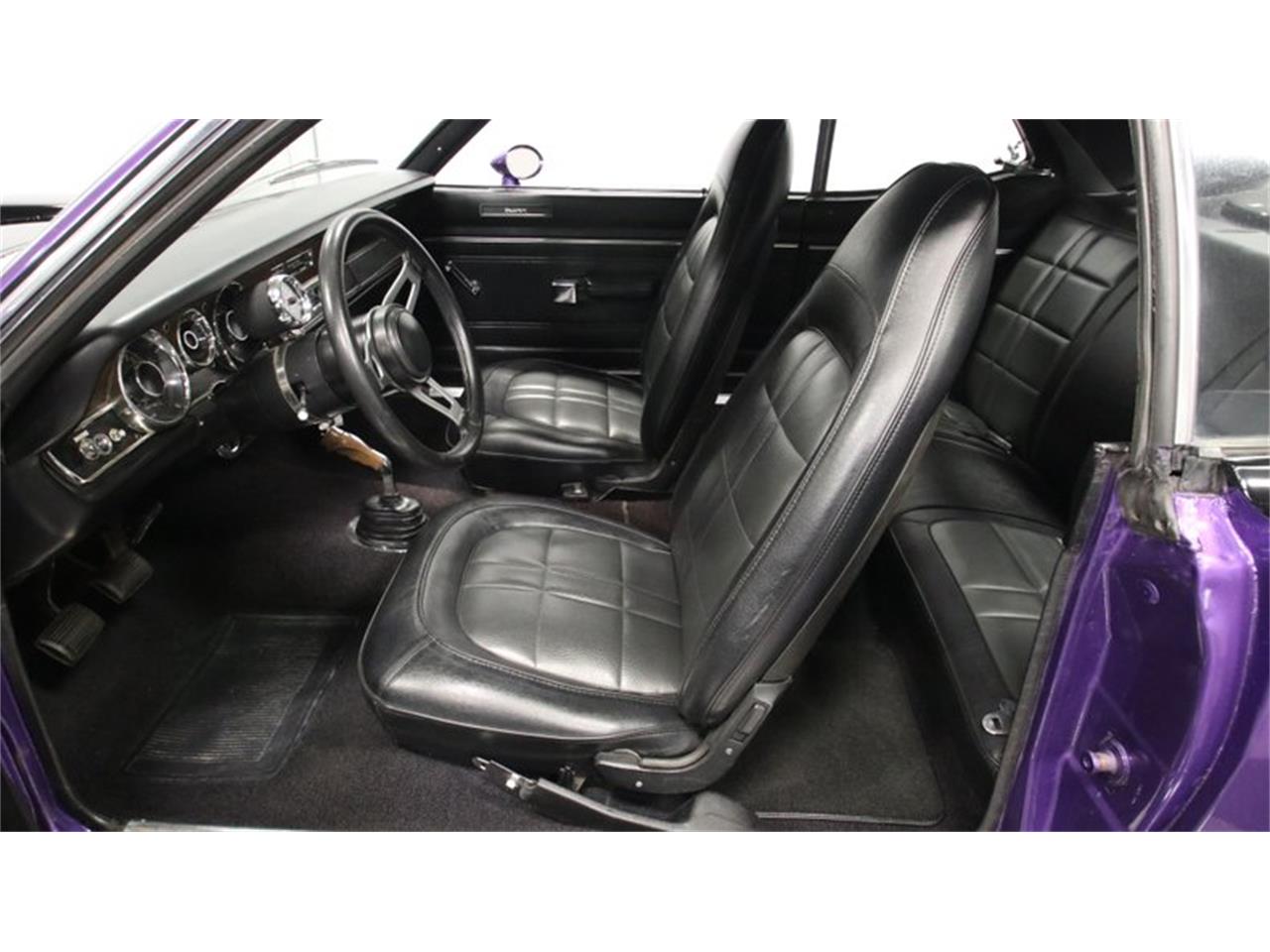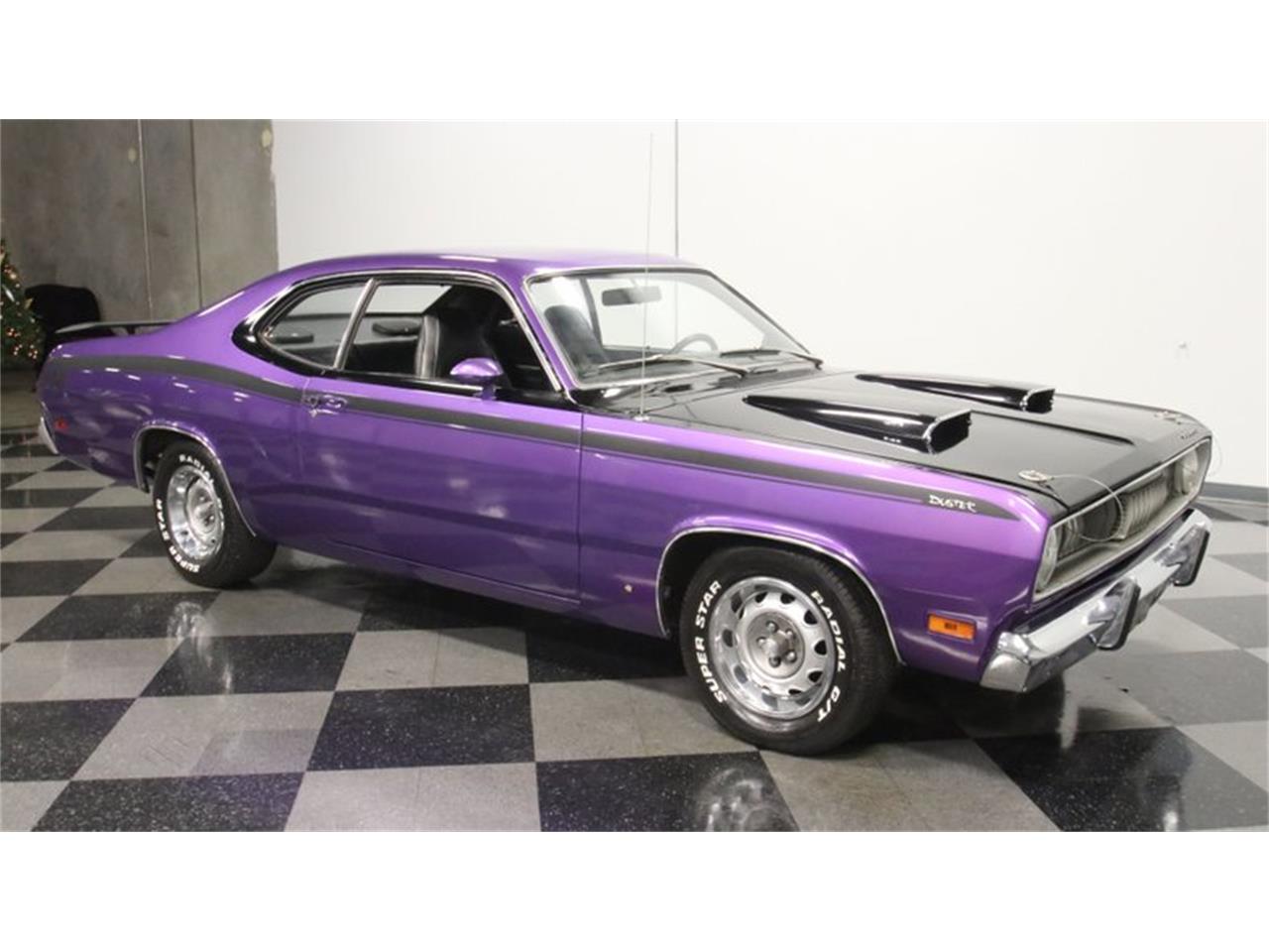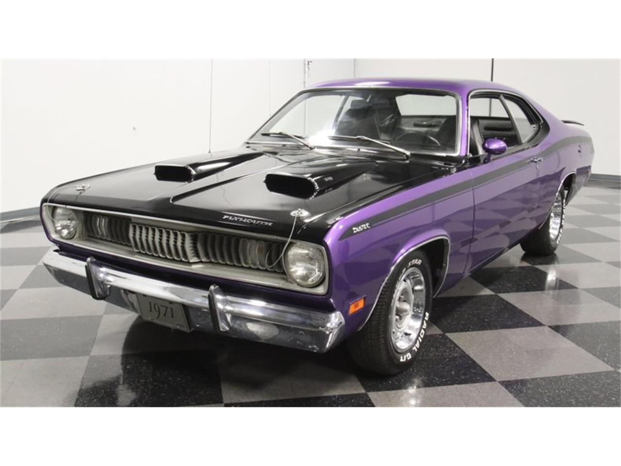 1971 Plymouth Duster 340. The black interior goes nicely with all the black accent of the exterior. The door panels, dash, and carpeting all have the look and feel of quality. Plus, the high-back bucket seats are taut and comfortable. There are some cool classic-style details added, like the Pioneer cassette player and Make Wave auxiliary gauges. Plus, this has all the right driver features, like Mopar's Tuff sports steering wheel, an upgraded column-mounted tach, and the iconic pistol-grip shifter. The deep purple has a nice radiance in the sunshine. Plus, these Duster 340s had one of the best accenting packages around with the blackout hood, blackout rear panel, and full length side stripe that highlights the curve in the profile. Even the line around the side windows is painted black. Those twin hood scoops lead the way. The bold orange motor really stands out against all the exterior-matching purple in the engine bay. This was born a Duster 340, and so it's great to have an era-correct block that looks correct, right down to the callout on the air topper. The dual exhaust makes that sweet sound you expect out of the big motor Duster, and the four-speed manual gives you full control of this muscle car soundtrack.