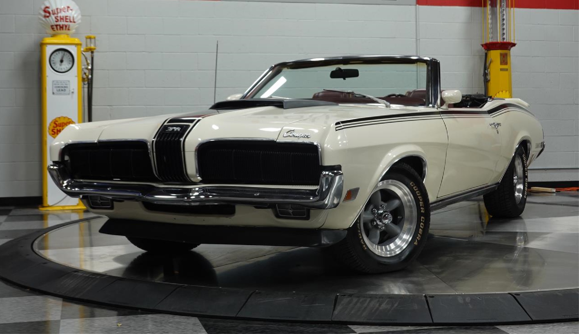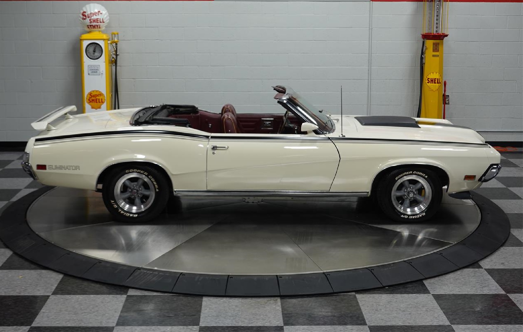 1970 Mercury Cougar. Under the hood is the 351 Cleveland V8. It has a big Quick Fuel double pumper atop an Edelbrock intake. Finned aluminum valve covers, a custom low-restriction air cleaner, and steel braided hoses throughout. Factory gauges including a beautiful, clearly legible tachometer greet the driver. Between the comfy bucket seats, a full center console houses the factory floor shifter with a comfortable T-handle. On the luxury side, there's factory air conditioning, power windows, and an upgraded stereo with controls neatly installed in the stock location. Power steering and power front disc brakes were standard. This Cougar has been treated to a comprehensive Eliminator makeover. Black stripes on the hood and on the sides accompany the "Eliminator" logos on the quarter panels.