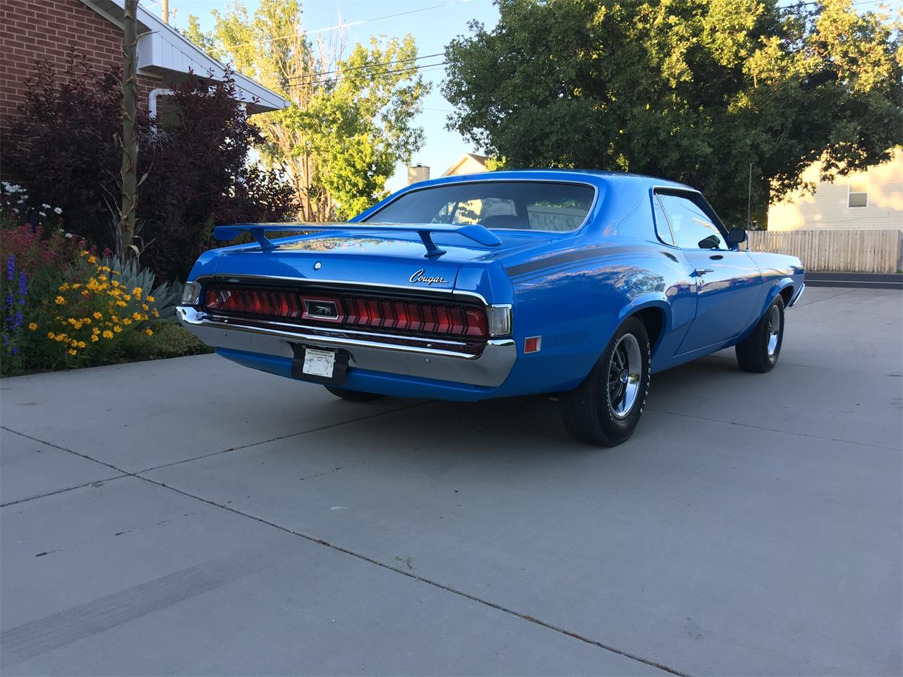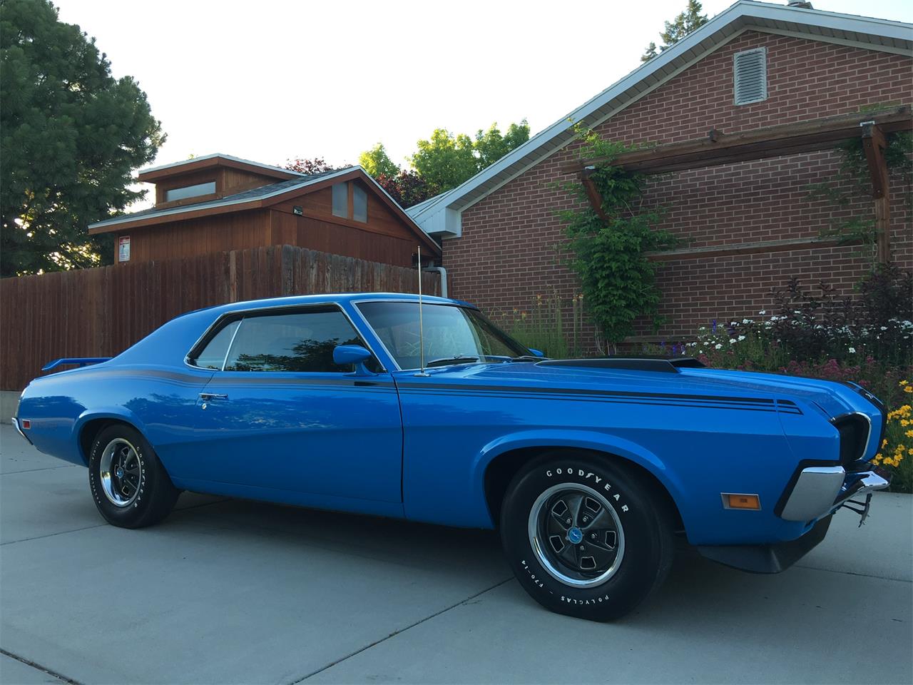 1970 Mercury Cougar Eliminator 428 Cobra Jet with Ram-Air. Sporting Competition Blue paint Eliminator special color. Options: Evaporative Emissions Eliminator Package C-6 Select Shift Cruise-O-Matic Transmission Traction-Lok Differential F70 x 14 Belted Tires Ram Air (functional only with the 428 CJ) Floor Console Power Front Disc Brakes Power Steering AM Radio (current AM 8 track) Tinted Glass-Complete