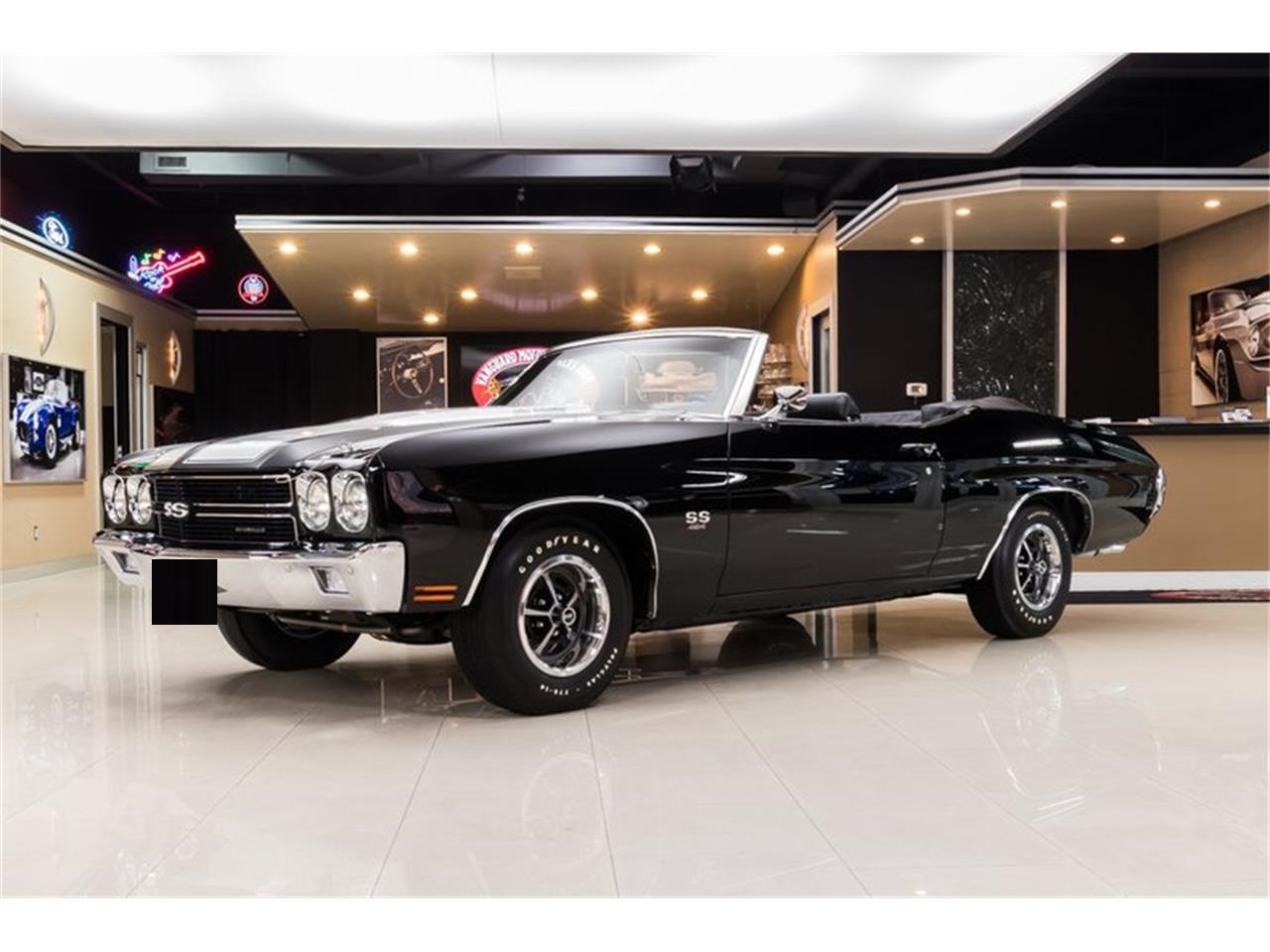 1970 Chevrolet Chevelle Convertible LS6 Recreation. This Chevelle has a laser straight body with a glossy Black Paint finish, Painted White Rally Stripes, along with a gorgeous Black Interior. This Chevy has undergone a complete Frame Off Restoration with a very high attention to detail that shows throughout the vehicle. Under the hood sits a GM 454ci V8, 512 Block mated to a Muncie 4 Speed Manual Transmission