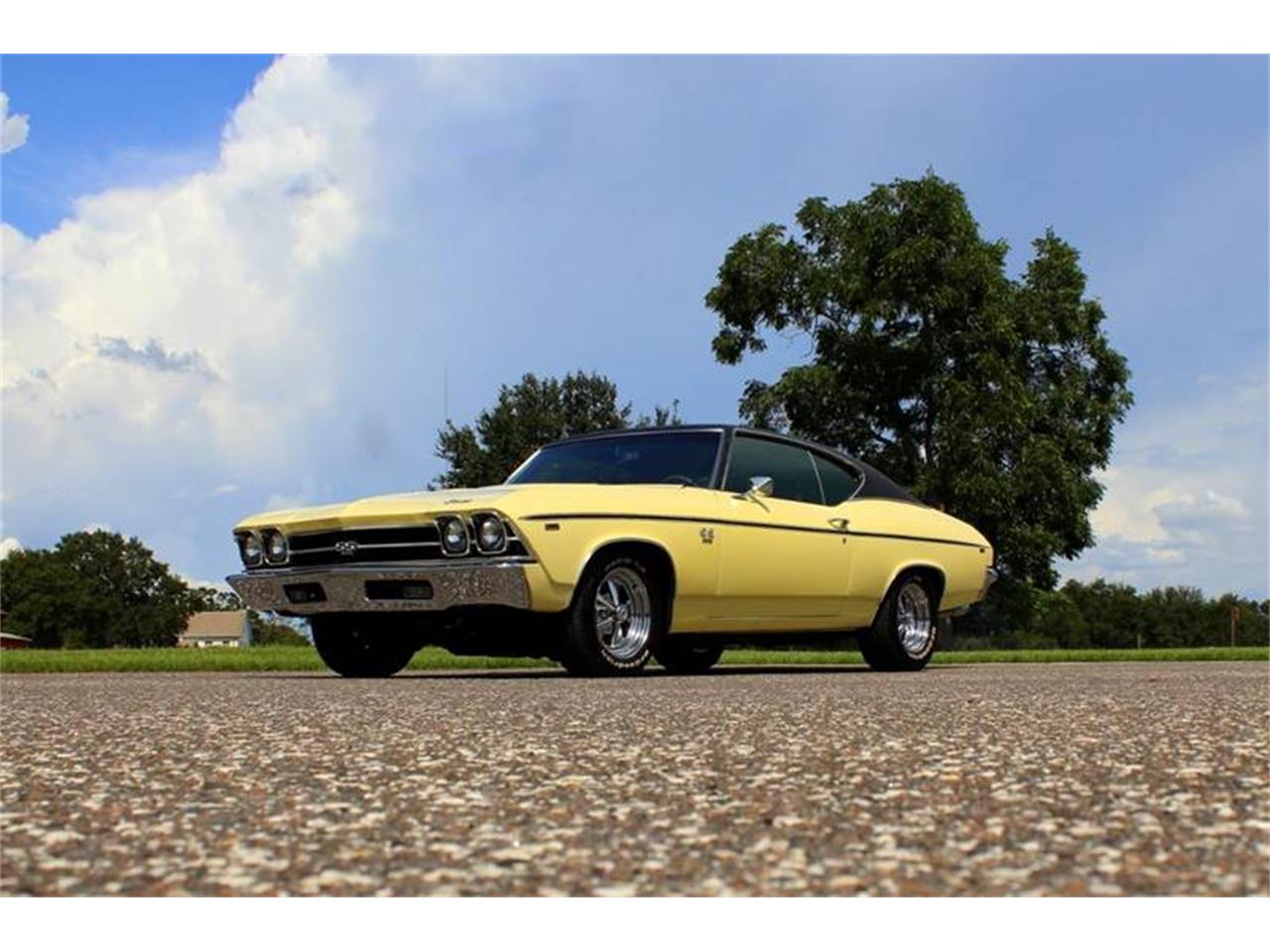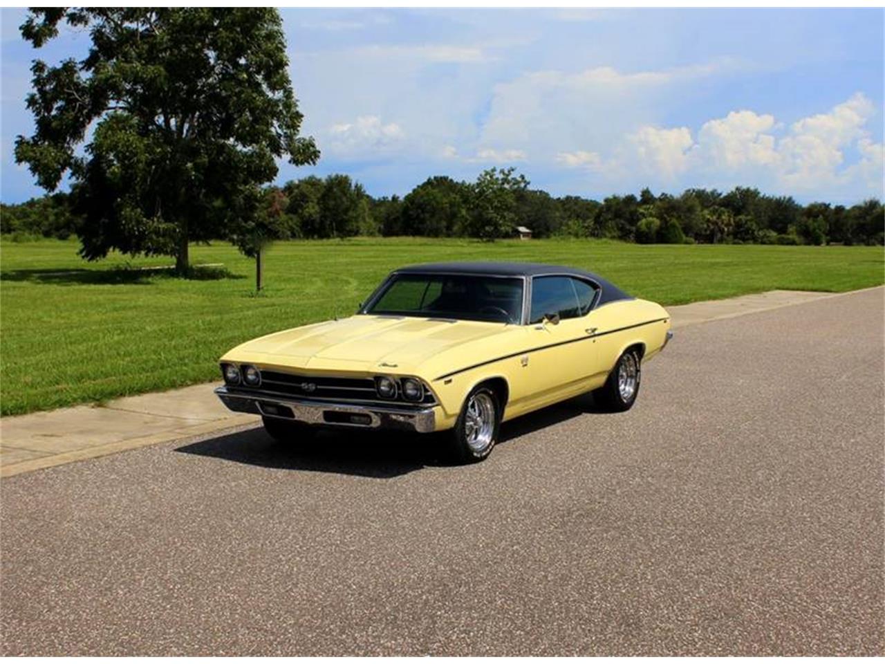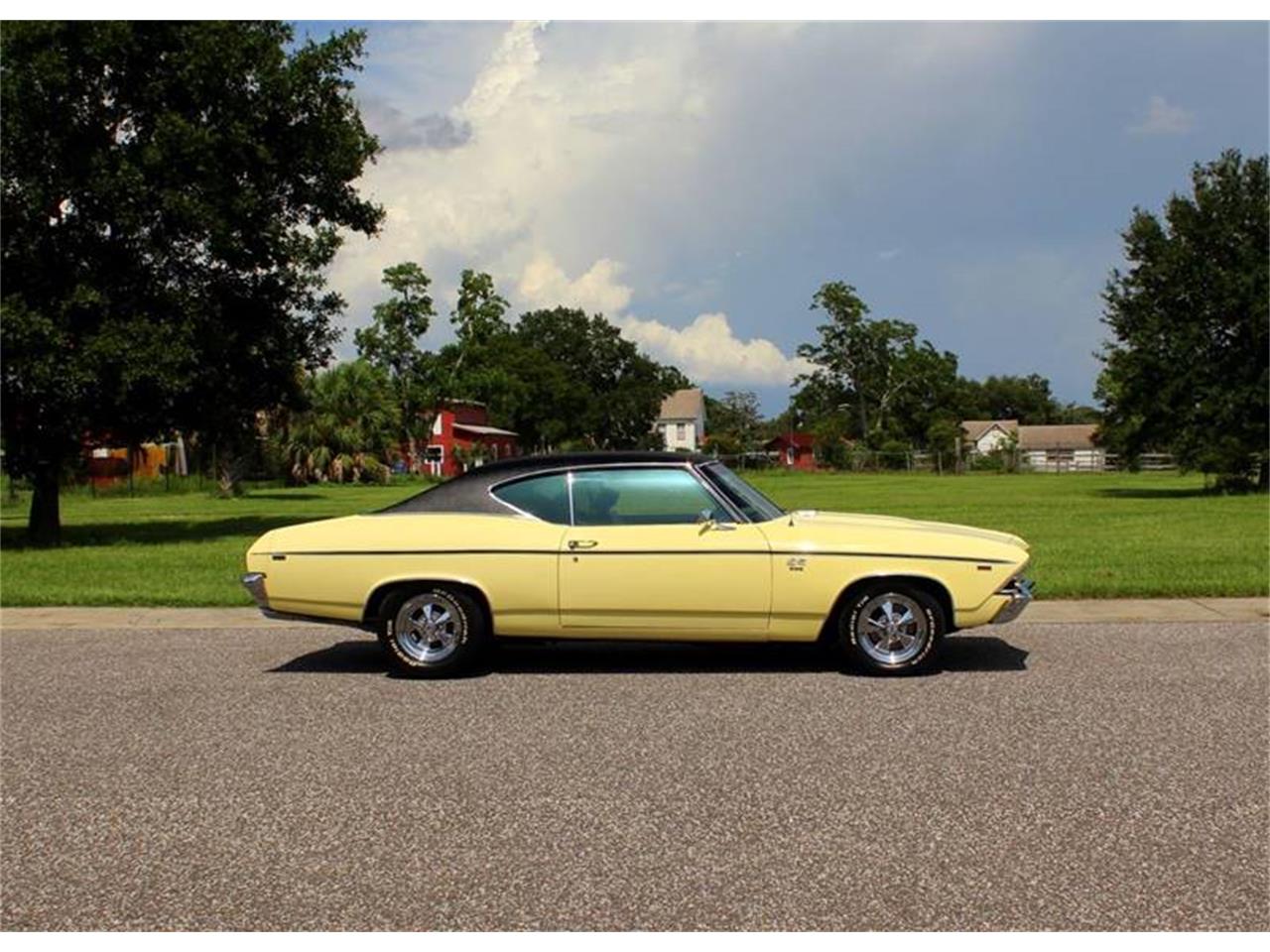 1969 Chevrolet Chevelle SS Restomod for Sale. Date Coded 396 engine, upgraded Edelbrock Intake, Holley Carburetor, stainless steel headers, dual exhaust, 700R4 overdrive transmission, Vintage A C, March serpentine belt system, dual electric fans, smoothed firewall, power steering, power disc brakes, 15 chrome Cragar SS wheels with BF Goodrich Radial T A tires, 12 bolt rear end, upgraded rear control arms, Code 40 Butternut Yellow exterior, black vinyl top, black stripe package, dual chrome sport mirrors.