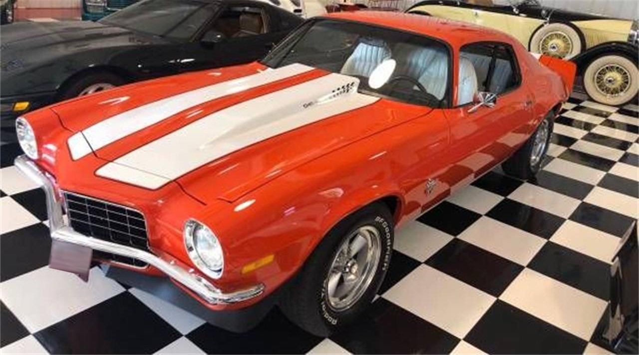 1972 Chevrolet Camaro Orange with white stripes and white interior. 454 automatic, Power steering, power brakes American racing wheels New: interior, white bucket seats, console, instrument panel, carpet, stereo. The car recently had a professional restoration. The engine compartment and undercarriage was detailed, paint job is very deep. The car runs and drives as great as it looks.