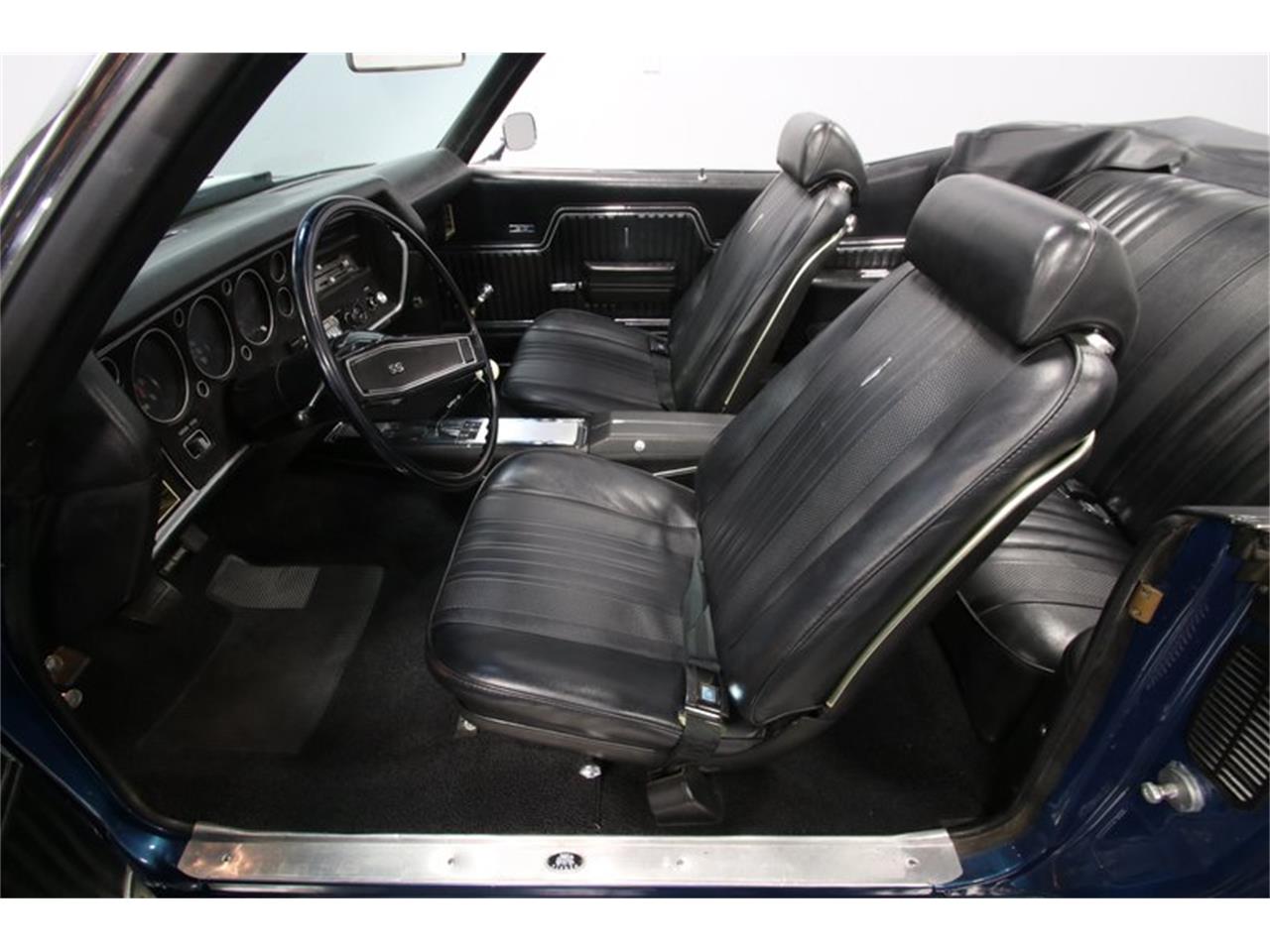 Pay close attention, because this 1970 Chevrolet Chevelle SS convertible really has everything you want. When you take the roof down, a new attitude emerges. The full black package with bucket seats and a center console gives it the true muscle car aggression you expect from a Super Sport. Crisp door panels, good carpeting, complete dash, and insignia trim on the seats ensure you'll proudly show this convertible off to the world. And the power convertible top makes this easy. But really, this is made for the driver to get the most enjoyment. The cue ball Hurst shifter is calling out to your right hand through the darkness. A dual spoke SS steering wheel means you get a clear view of the U14 gauge cluster with large speedo, tach, and working clock.