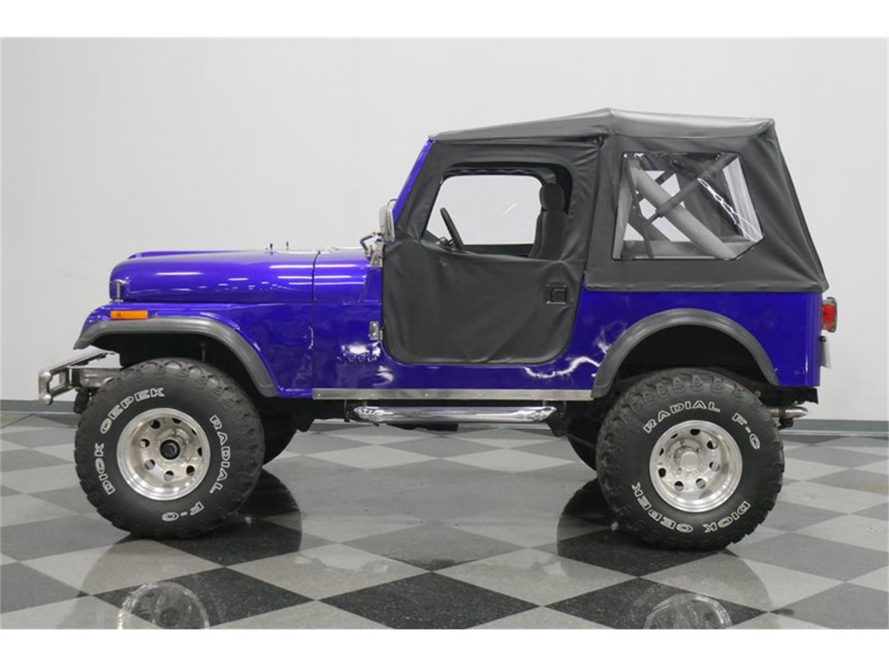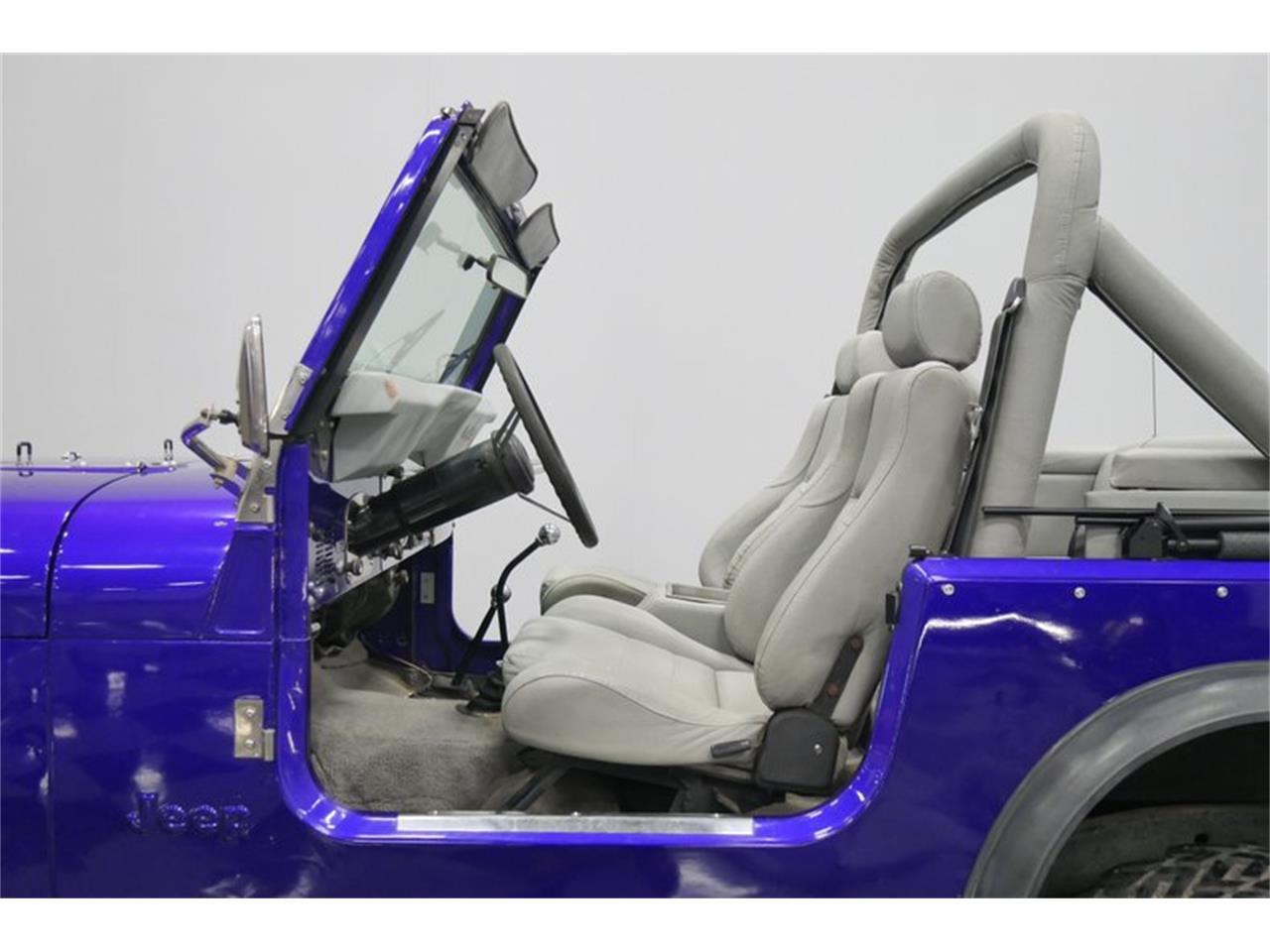 1983 Jeep CJ7 AMC's big 360 cubic-inch V8, five-speed manual transmission. It even features a bored .030 over kit. The V8 inhales deeply with an Edelbrock 600 CFM four-barrel carburetor w/electric choke, and it exhales with authority as headers feed the dual exhaust. 4x4 with a two-speed transfer case, a lifted suspension, and Dick Cepek tires. Plus, the suspension bushings, leaf springs, shocks, and steering stabilizer all deliver a confident feeling. And the power steering and front disc brakes are welcomed feature on the road or off the pavement. The front buckets are exceptionally comfortable with good bolstering, wide headrests, and a cup holder center consoles in-between. The rear also gets cup holders, and there are lockable storage consoles on each side. The dash looks nice as it combines the exterior purple, interior gray, and plenty of polish.