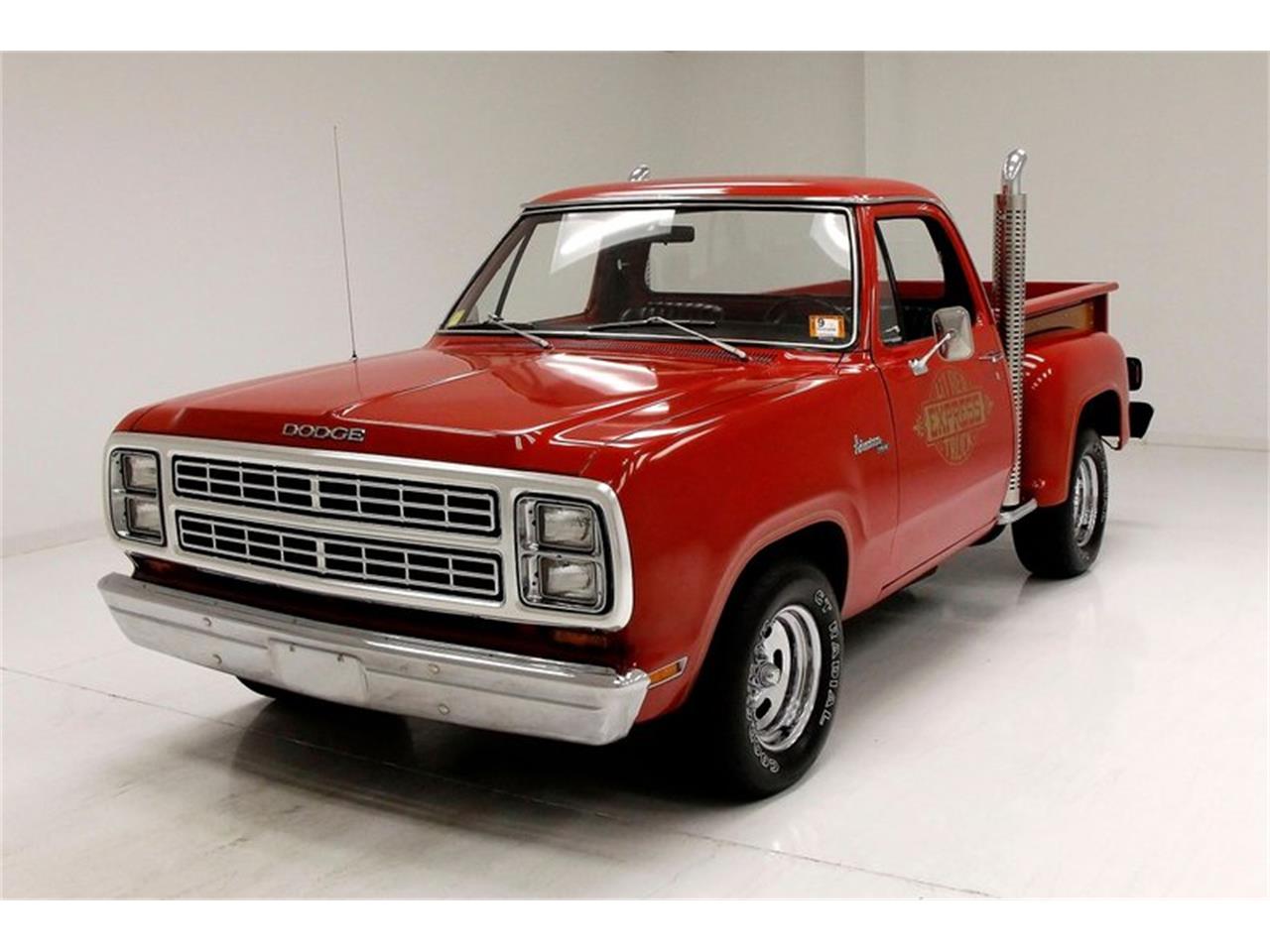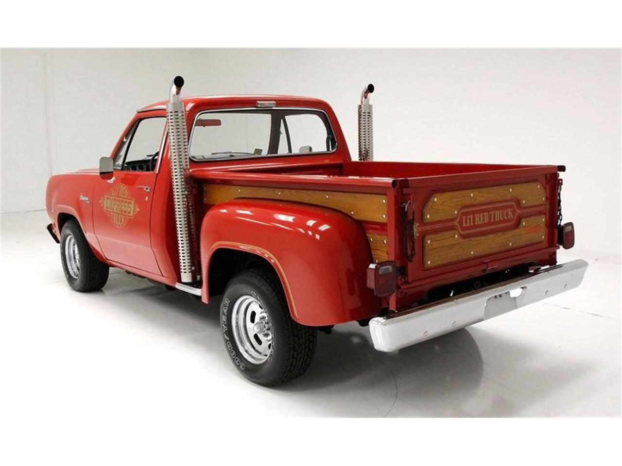 1979 Dodge D100 Lil Red Express. There is nothing subtle about these rambunctious machines, with the name emblazoned on the doors in gold decals, wood inserts on the bed, chrome wheels and those audacious exhaust stacks.