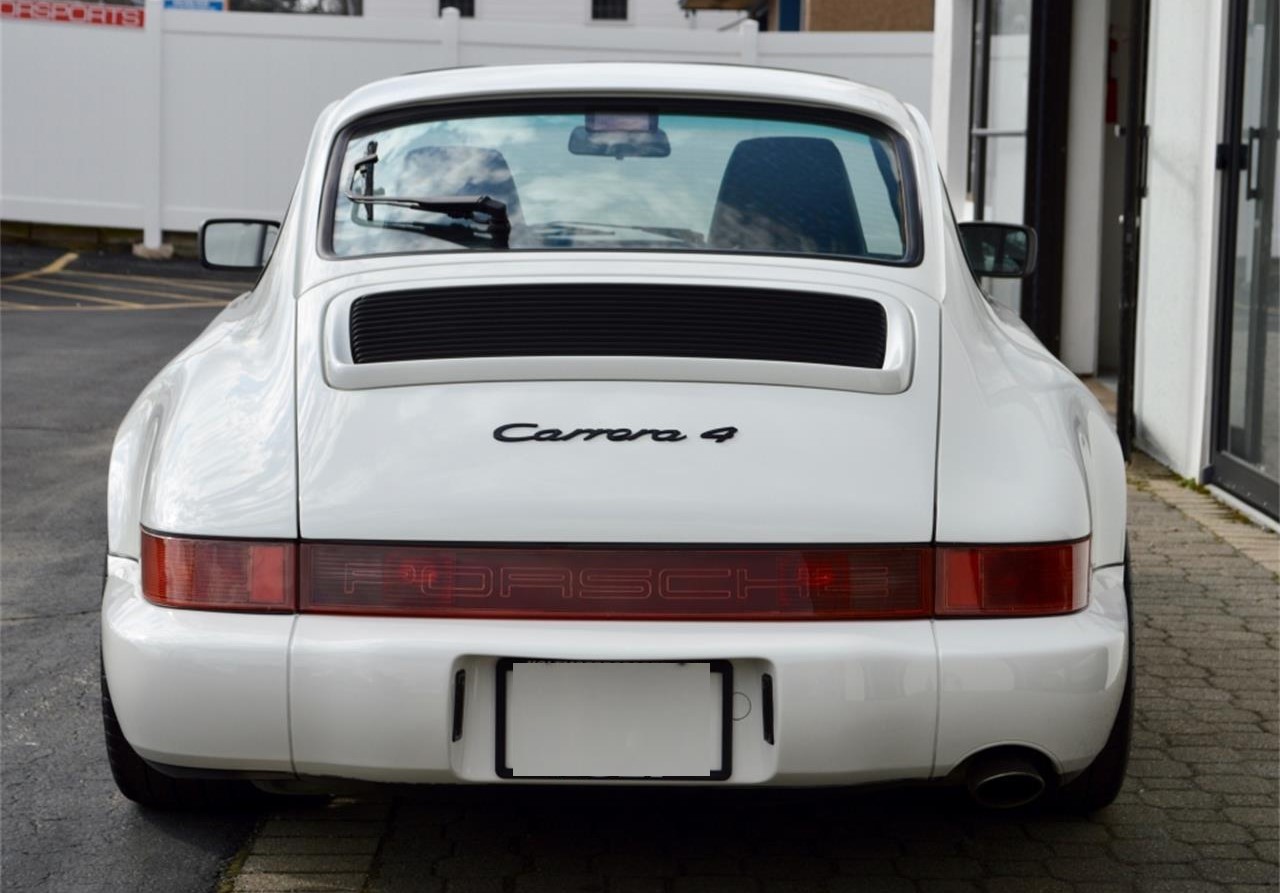 1990 Porsche Carrera 4, Grand Prix White over Black Sport Seats, 54K Miles, 5 Speed Manual. A spectacular,must drive to fully appreciate the condition , all original Grand Prix white coupe. 18 RH German Cup wheels. Full engine out reseal with ARP head studs, copious records. Upgraded coiler street suspension. Few 964 s in USA this clean. Fabulous original paint throughout and excellent mechanical condition.