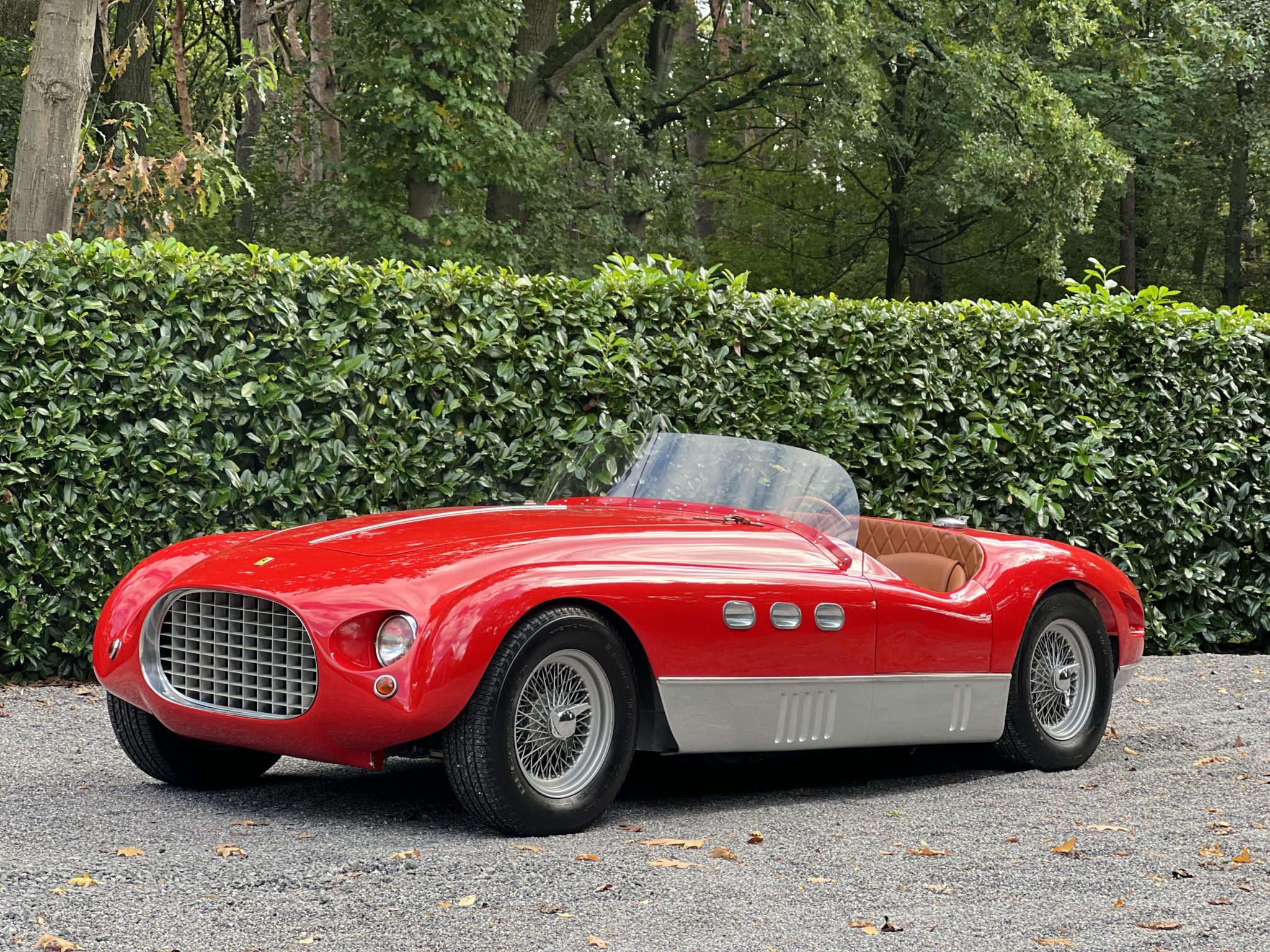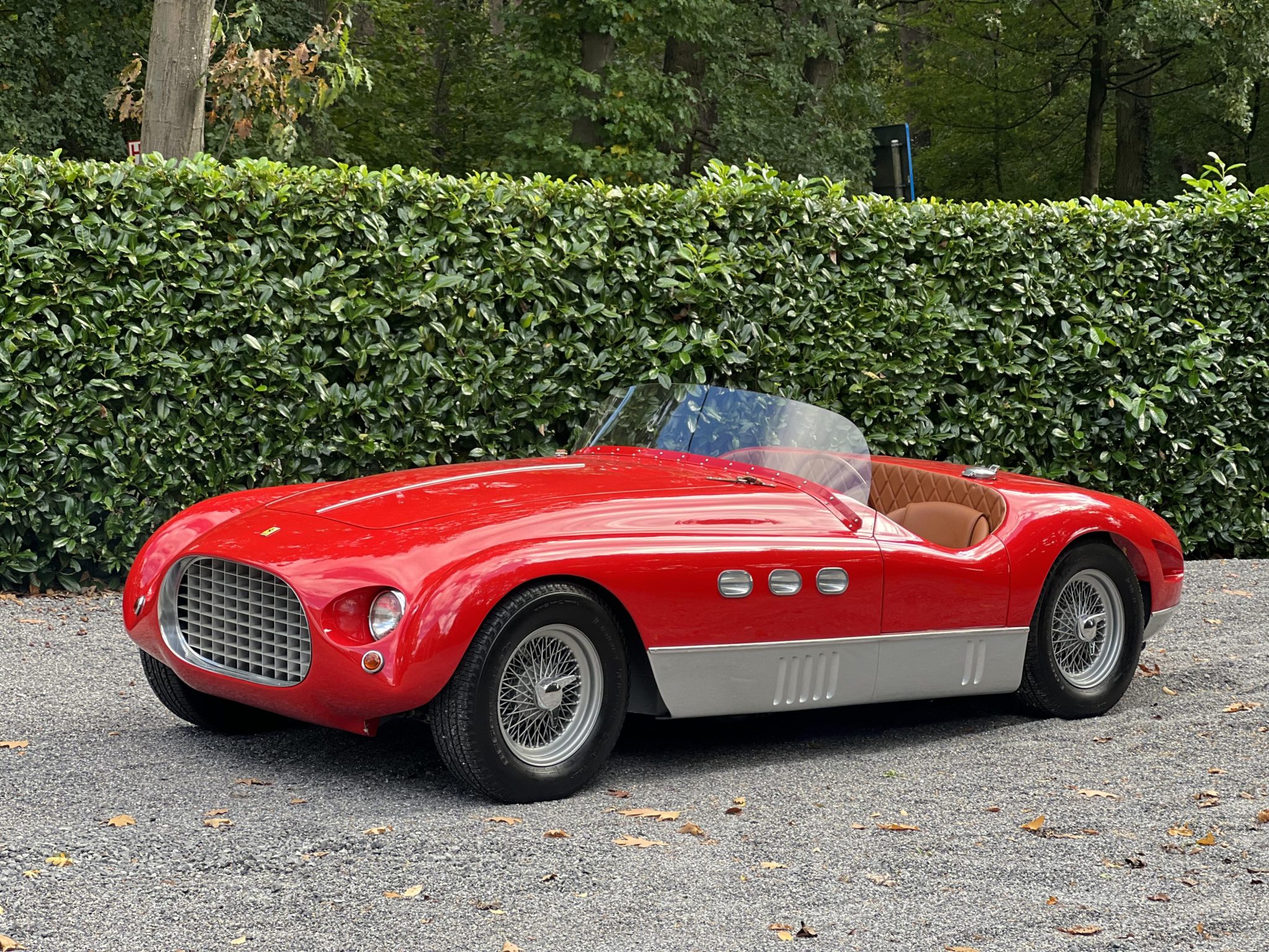 This re-creation’s aluminum body was fabricated by MC Auto Creations in the style of a Vignale spider and is finished in red with gray rocker panels. Design features include triple oval portholes in each fender, triangular ducts behind each rear wheel, a forward-hinged hood panel with louvers and leather hold-down straps, recessed headlights, a single-piece windshield, and a Monza-style fuel filler cap.