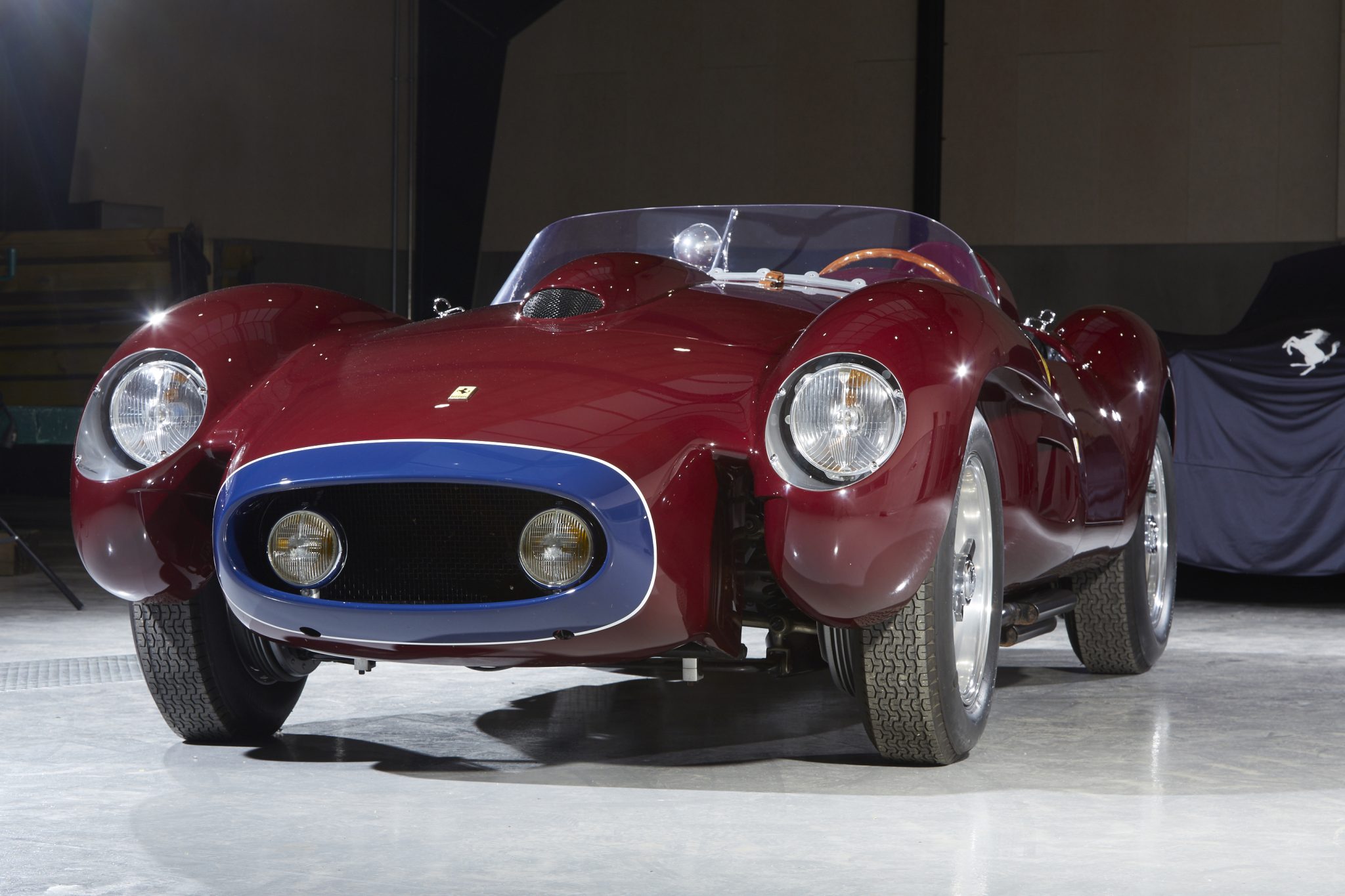 This re-creation features aluminum coachwork finished in burgundy with a blue and white accent around the leading edge of the nose. Features include faired Marchal headlights, Cibie yellow foglights set within the grille, a hood scoop, a full-width plexiglass windshield, a driver-side rear fairing housing a fuel-filler cap, Scuderia Ferrari fender shields, and quad megaphone exhaust outlets.