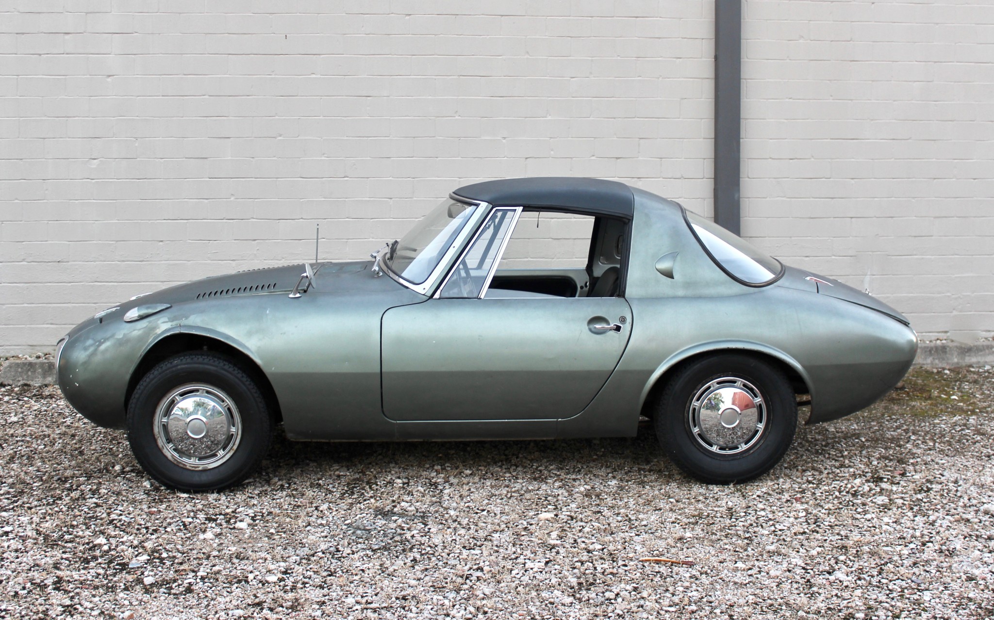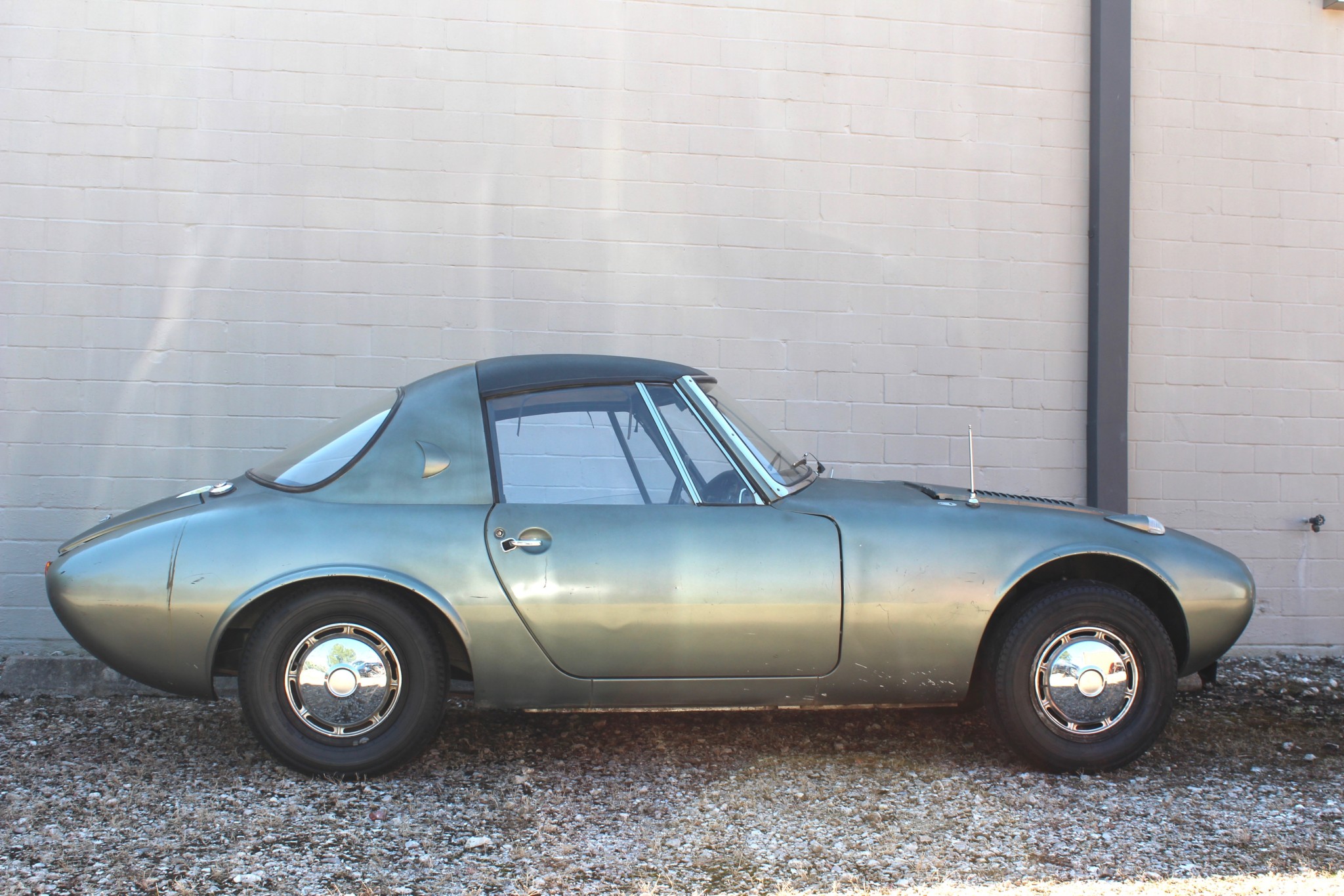 More than 3,100 Sports 800s were produced, though only about 300 were left-hand drive. The 12″ steel wheels on this example wear polished hubcaps and show corrosion.