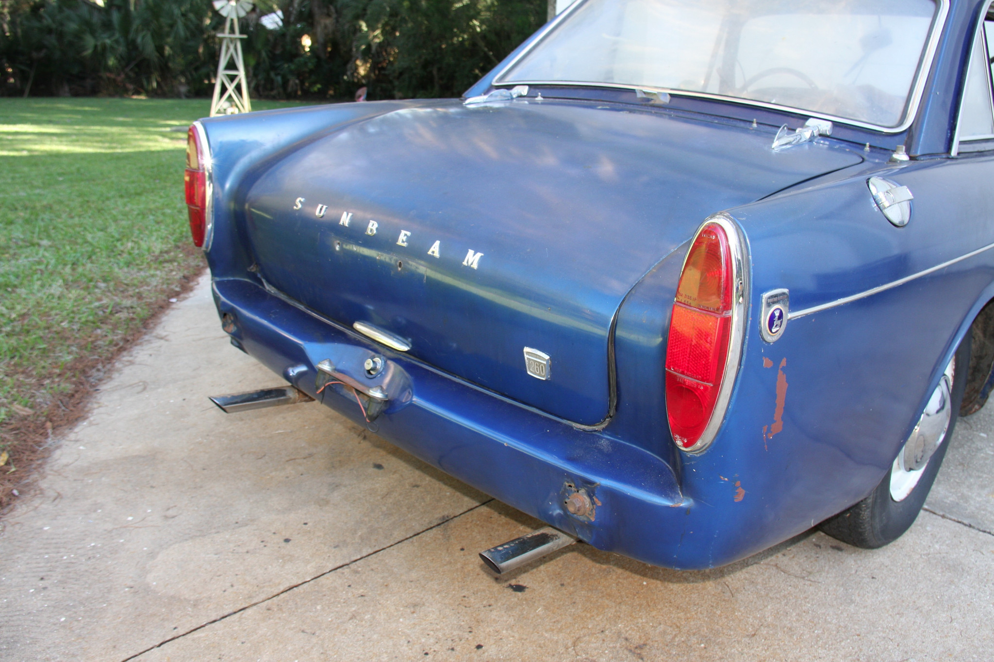 All side trim is included and looks good with newly chromed bumpers (bumpers not shown on car) and original hubcaps. Chrome is said to be in good condition as are the marker lights and grille. The Tiger includes the 3-piece metal tonneau, covering the convertible top, and original hard top in serviceable condition.