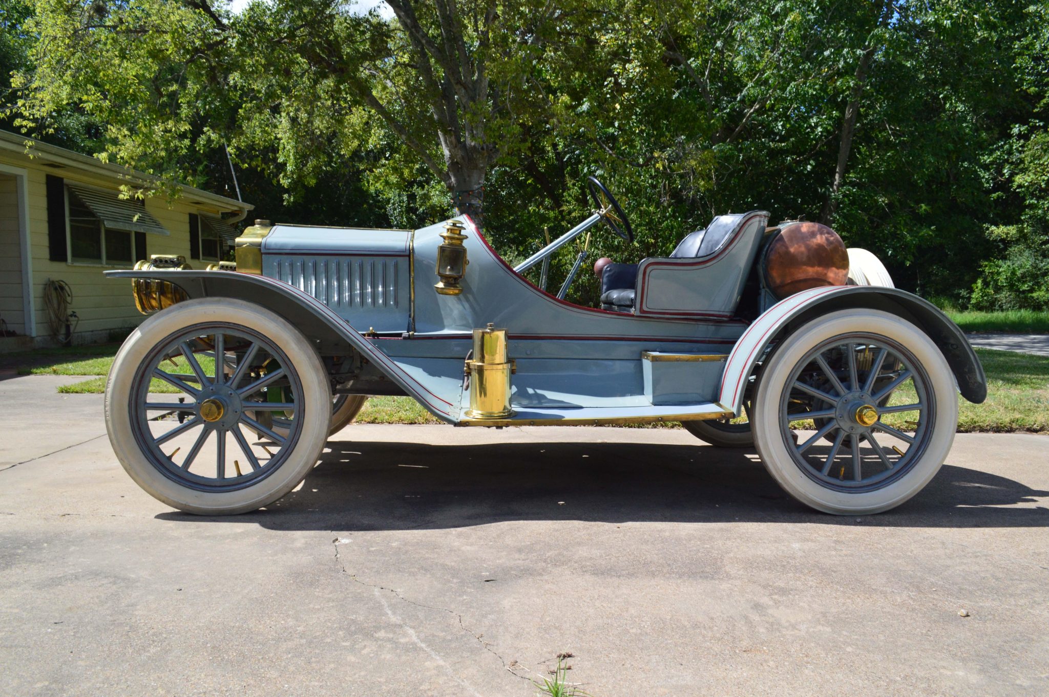 The Model Q-4 was offered in 1910 and 1911, and this example was overhauled by the seller’s father in the late 1950s, with work including fitting a partially reconstructed Semi-Racer body that is finished in gray with red pinstriping. Features include kerosene-powered rear and cowl lanterns, a copper fuel tank, running boards, a carbide generator, a horn, and a brass radiator surround.