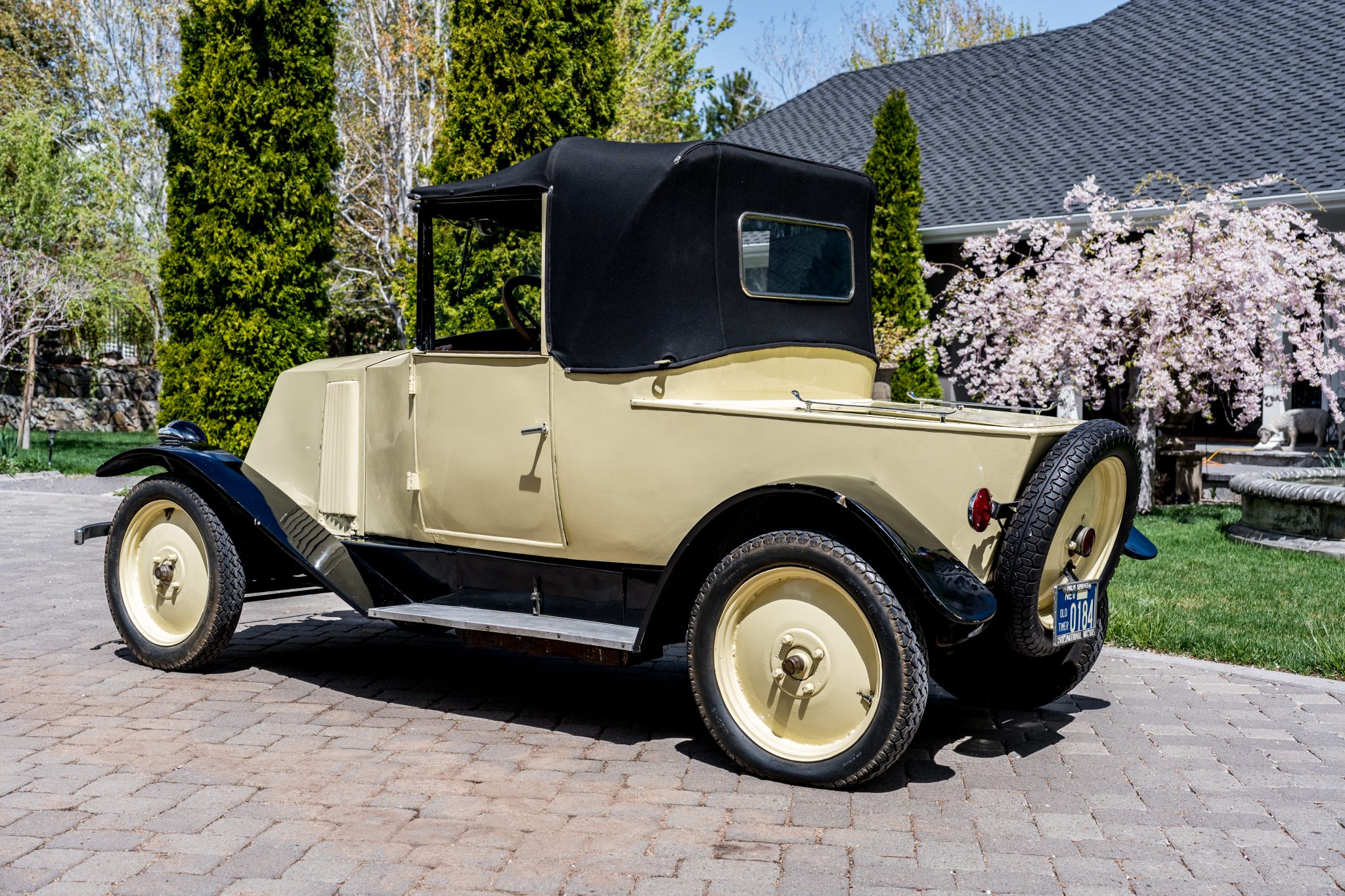 This KJ1 example is finished in light yellow and features a black soft top. Further exterior details include black fenders, running boards, a chrome-finished front bumper, storage compartments, rear luggage rails, a single brake light, and aftermarket rear turn signals. The bonnet is said to have been replaced under current ownership. Various imperfections in the paint are noted.