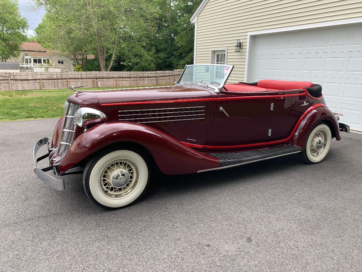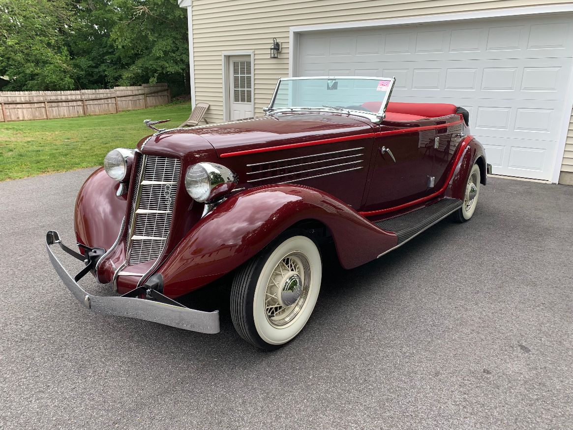 The cream-painted wire wheels wear chrome hubcaps and are mounted with bias-ply whitewall tires. A matching spare wheel is fitted under a body-color cover out back. The solid-axle suspension incorporates semi-elliptical leaf springs as well as front lever-arm and rear hydraulic shock absorbers. Stopping power is provided by hydraulic drum brakes at each corner.