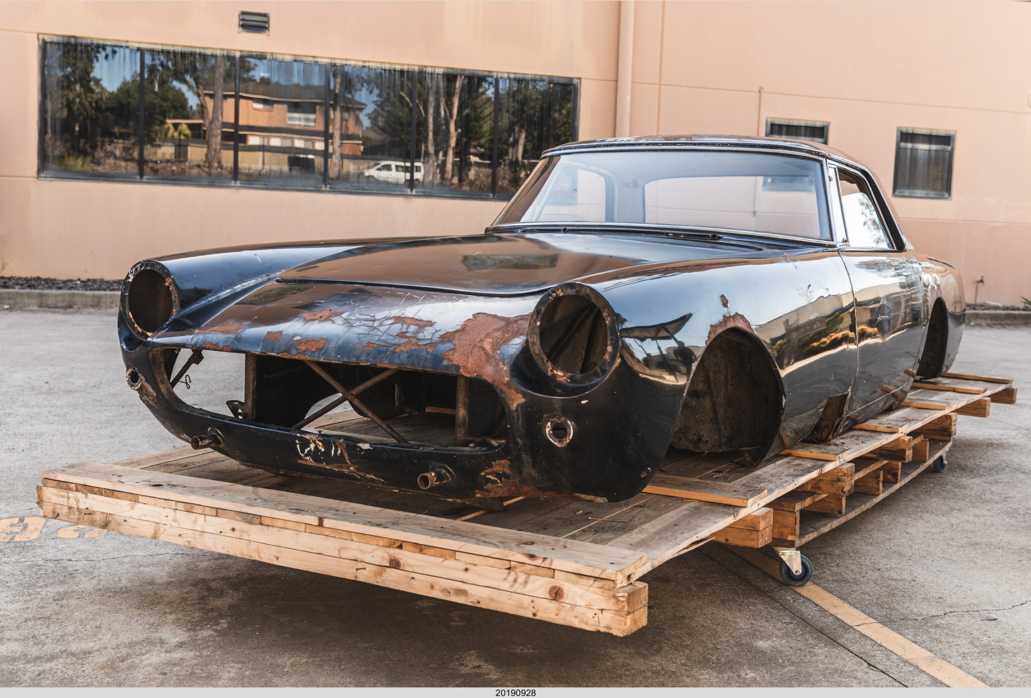 Areas of flaking are visible in the black paint, with rust evident on the exposed steel. Sections of the body were cut when the car was separated from the chassis, and metal repair is required on the lower sections of the body including the rocker panels, lower front fenders, trunk floor, and rear valance.