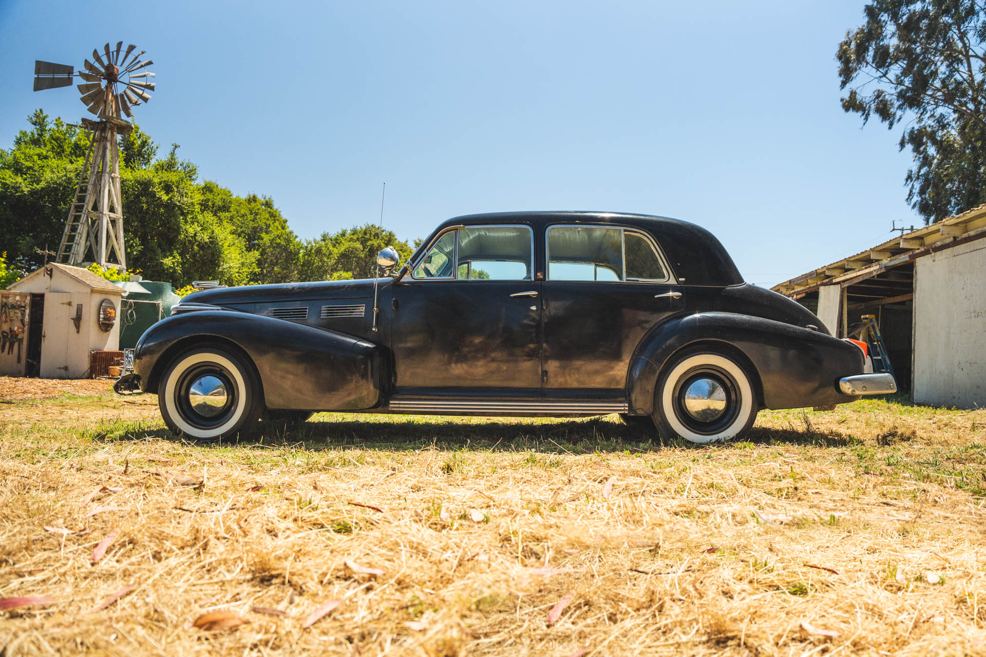 Body-color wheels wear chrome hubcaps, and they are mounted with Columbia Deluxe bias-ply whitewall tires. A spare wheel is stowed beneath the trunk floor. The 60 Special rode on a 127″ wheelbase and featured an X-frame chassis with a coil-sprung independent front suspension and rear semi-elliptical leaf springs. The car retains hydraulically assisted drums at all four corners.