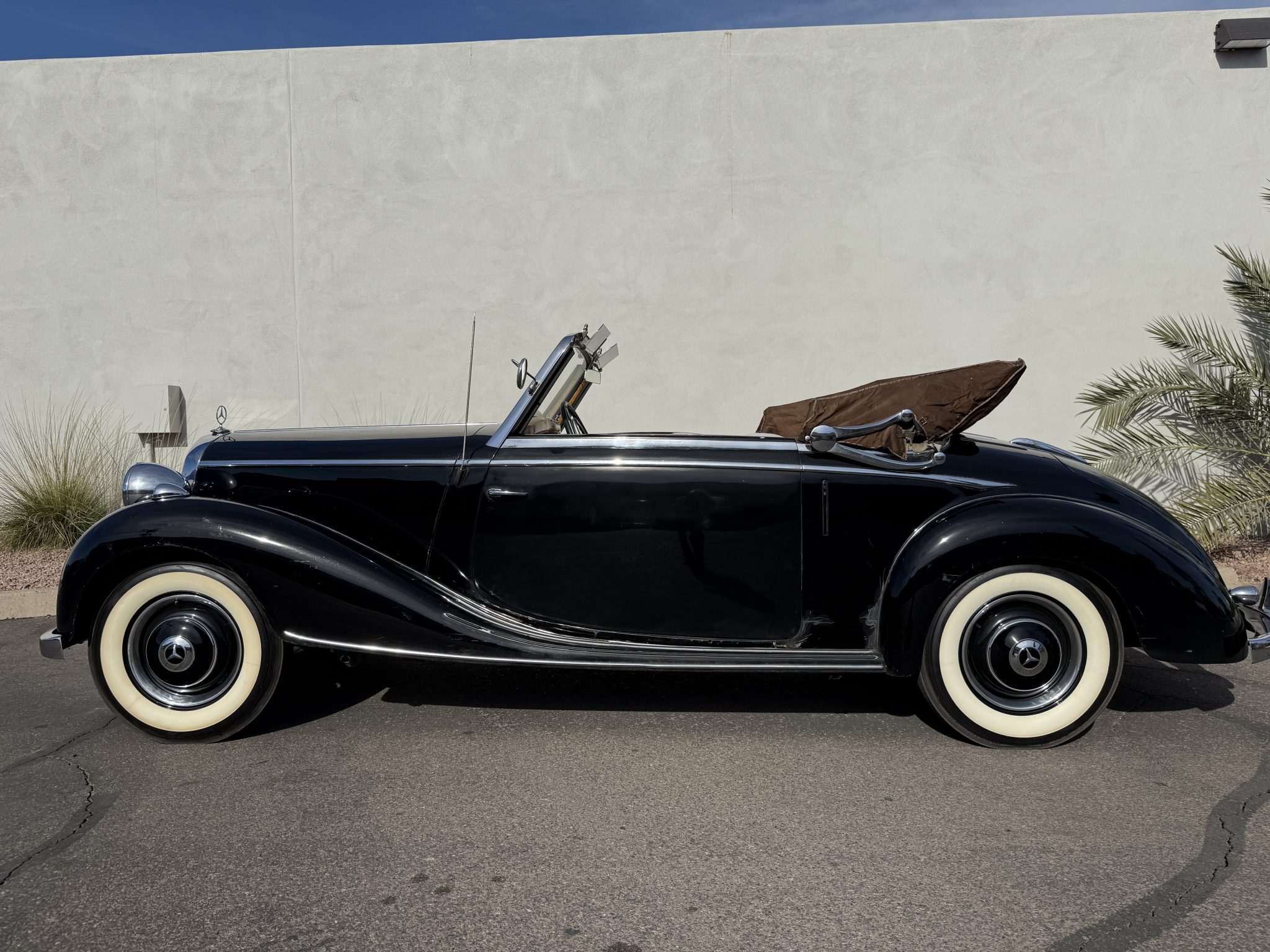 Painted steel wheels wear body-color hubcaps and are mounted with BFGoodrich Silvertown whitewall tires. The car is equipped with double-wishbone front suspension, a coil-sprung rear swing axle, and four-wheel drum brakes, the latter of which were reportedly serviced in preparation for the sale.