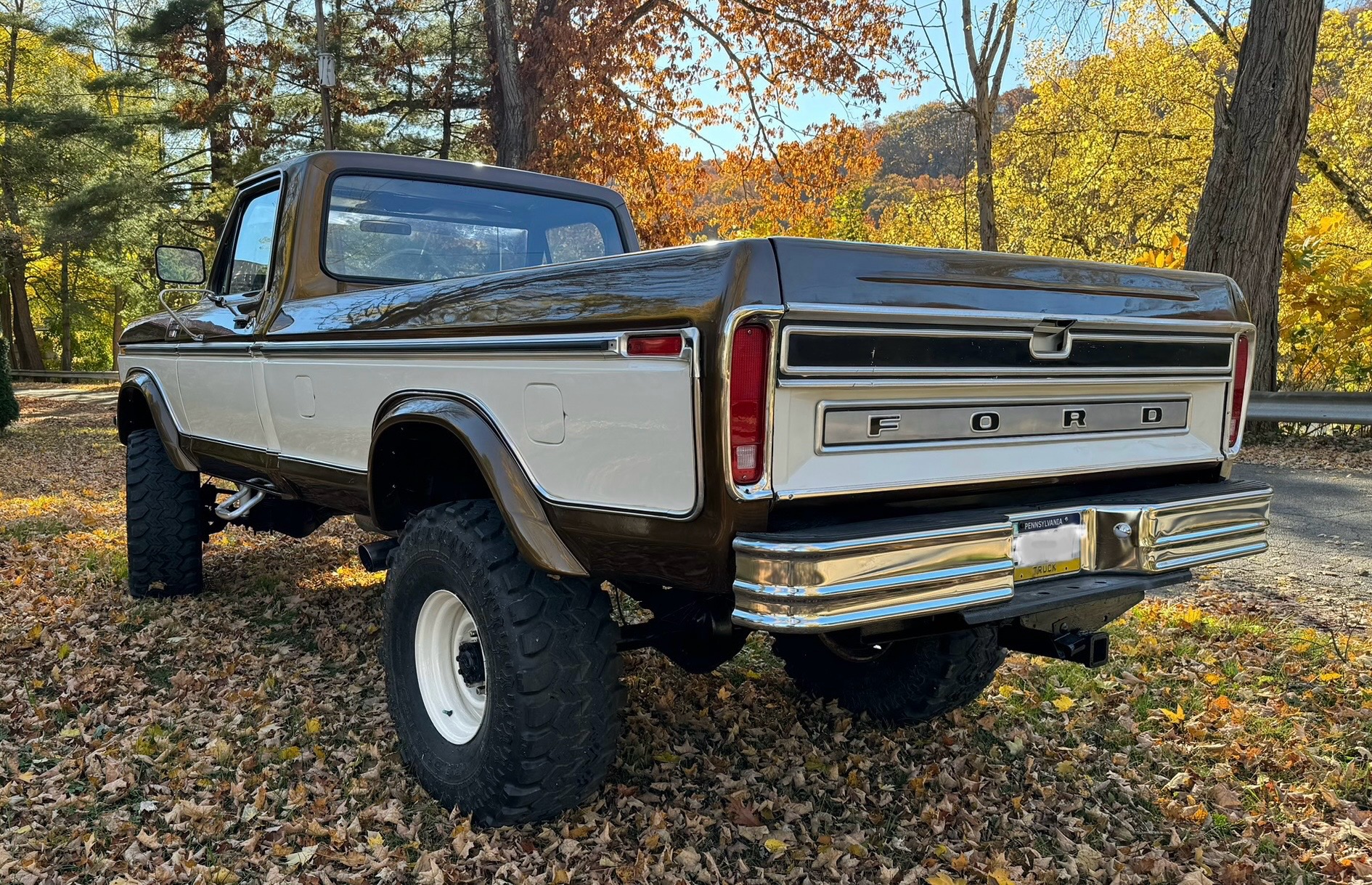 White 16.5″ steel wheels are mounted with 38×15.5″ Super Swamper Radial TSL tires. The truck is equipped with manually locking front hubs, power steering, and a Skyjacker 6″ suspension lift. Braking is handled by cross-drilled and slotted discs up front and drums out back along with braided stainless-steel lines.