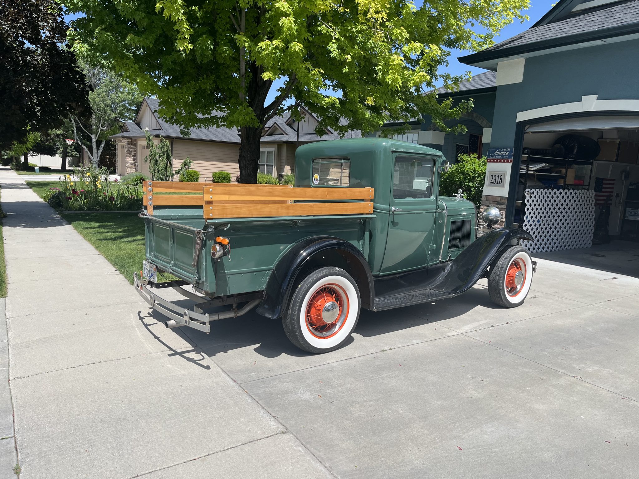 Red-painted 16″ wire wheels wear chrome trim rings and hubcaps as well as wide-whitewall tires. A spare wheel is mounted in the left-front fender. Braking is provided by four-wheel drums.