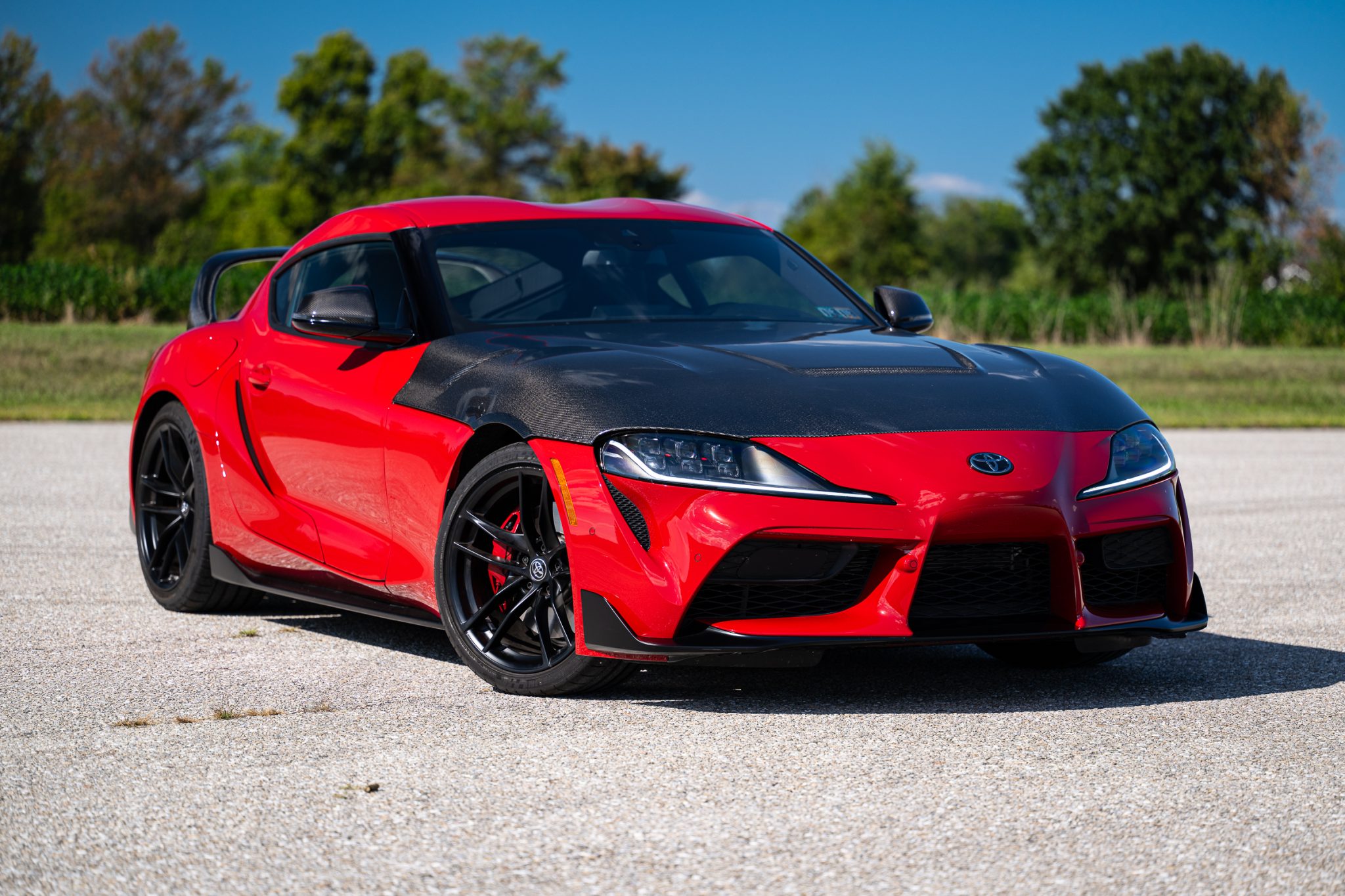 Black-finished 19″ forged aluminum wheels are mounted with 255/35 front and 275/35 rear Michelin Pilot Super Sport tires with 2019 date codes. The car features an Adaptive Variable Sport Suspension, and braking is handled by red-finished Brembo four-piston calipers over ventilated discs.
