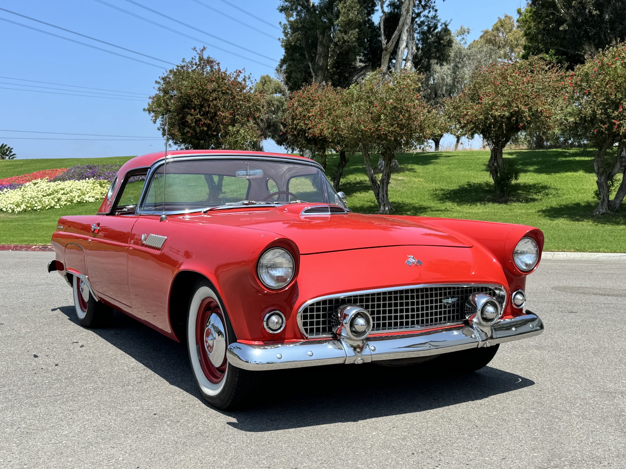Body-color 15″ steel wheels with red-accent hubcaps are mounted with 205/75 Coker whitewall radial tires. A BFGoodrich space-saver spare is located in the trunk. The car has power steering, and braking is provided by power-assisted front discs and rear drums.
