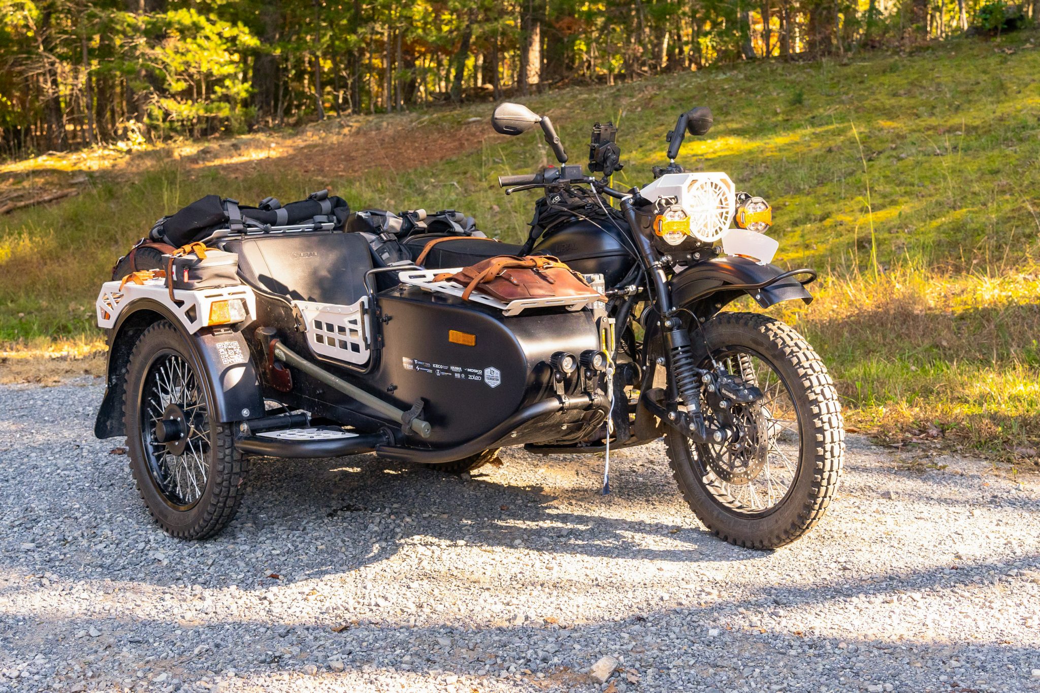 Accessories include a white powder-coated Kalaber rear rack as well as a Mosko Moto Reckless 80L rackless luggage system, a Gnome tank bag, and a Backcountry 40L duffle. A Kalaber Gen 3 winch mount bar attached to the main frame between the bike and the sidecar anchors a Superwinch Terra 2500 with a 1.5-horsepower permanent magnetic motor and a 2,500-lb pull capacity. Lighting is supplemented by a pair of Denali D7 Pro 4″ multi-beam driving light pods that provide over 23k lumens and a multi-color daytime running light (DRL) mode.