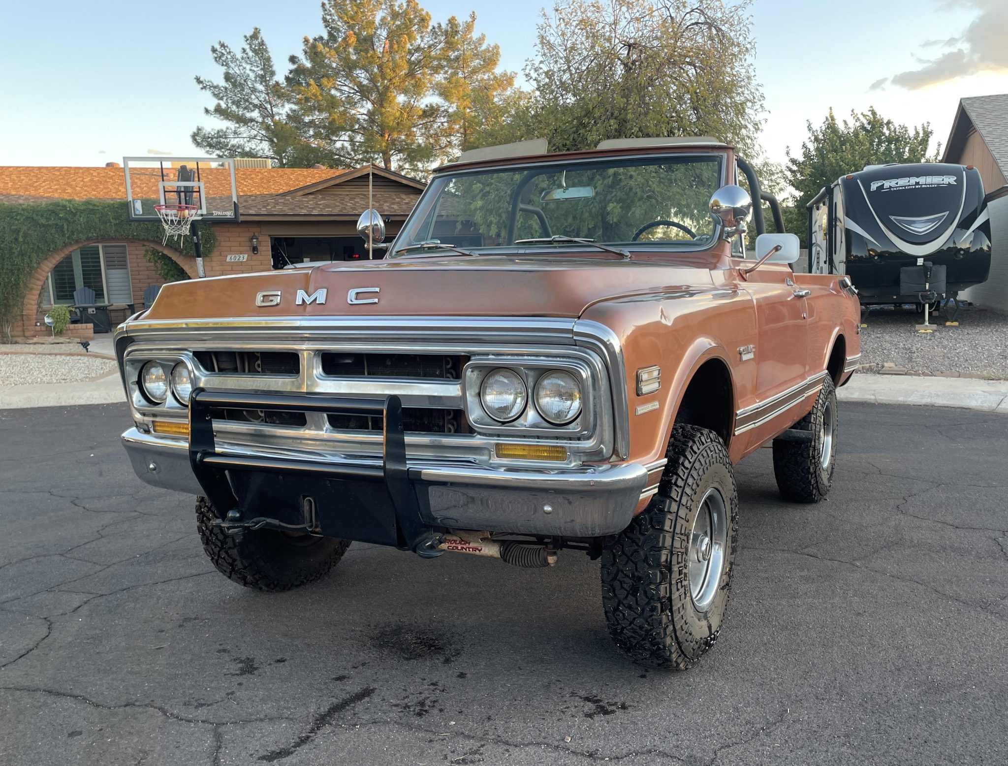 The 15″ Rally wheels are mounted with 33×9.5″ Kenda Klever R/T tires. The truck is equipped with power steering, dual Rough Country steering stabilizers, and a 2″ suspension lift.