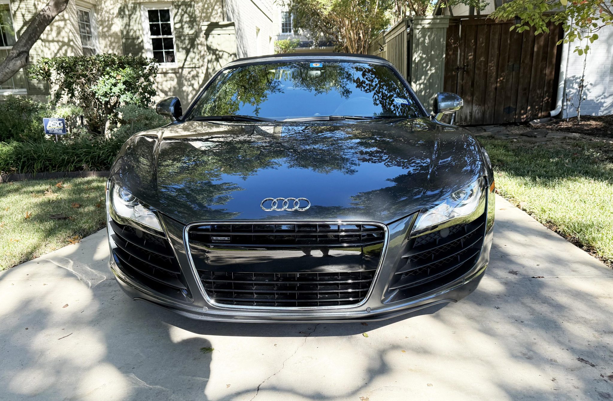 Polished 19″ double-spoke wheels are mounted with Pirelli tires the seller recommends replacing due to age. Audi Magnetic Ride magnetorheological dampers were standard equipment on the R8, and braking is handled by four-wheel ventilated and cross-drilled discs. The seller also recommends flushing the brake fluid.