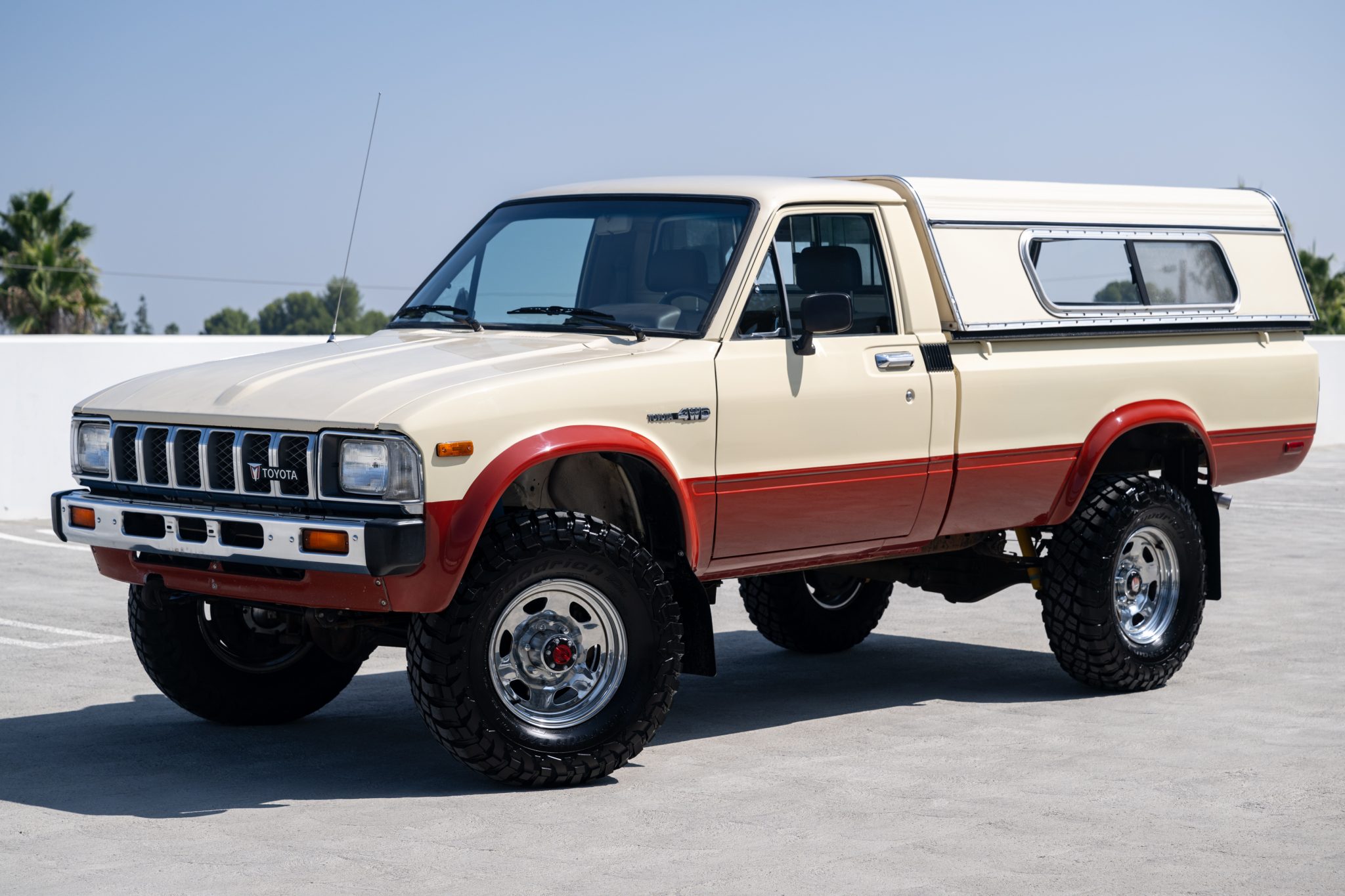 Chrome 15″ wheels are mounted with BFGoodrich All-Terrain T/A KM3 tires. The steering knuckle was rebuilt in January 2024, at which time Bilstein shocks were installed and the brake booster, master brake cylinder, and front brake pads, rotors, and calipers were also replaced.