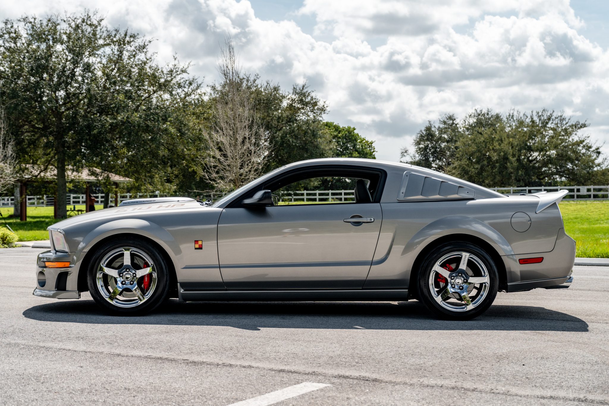 Roush 18″ forged wheels are mounted with 275/40 BFGoodrich g-Force T/A tires. The Roush Stage 3 suspension included revised swaybars, springs, front struts, rear shocks, and pinion snubbers. Braking is provided by red-finished calipers over slotted rotors at all four corners. The ABS module was replaced in preparation for the sale.