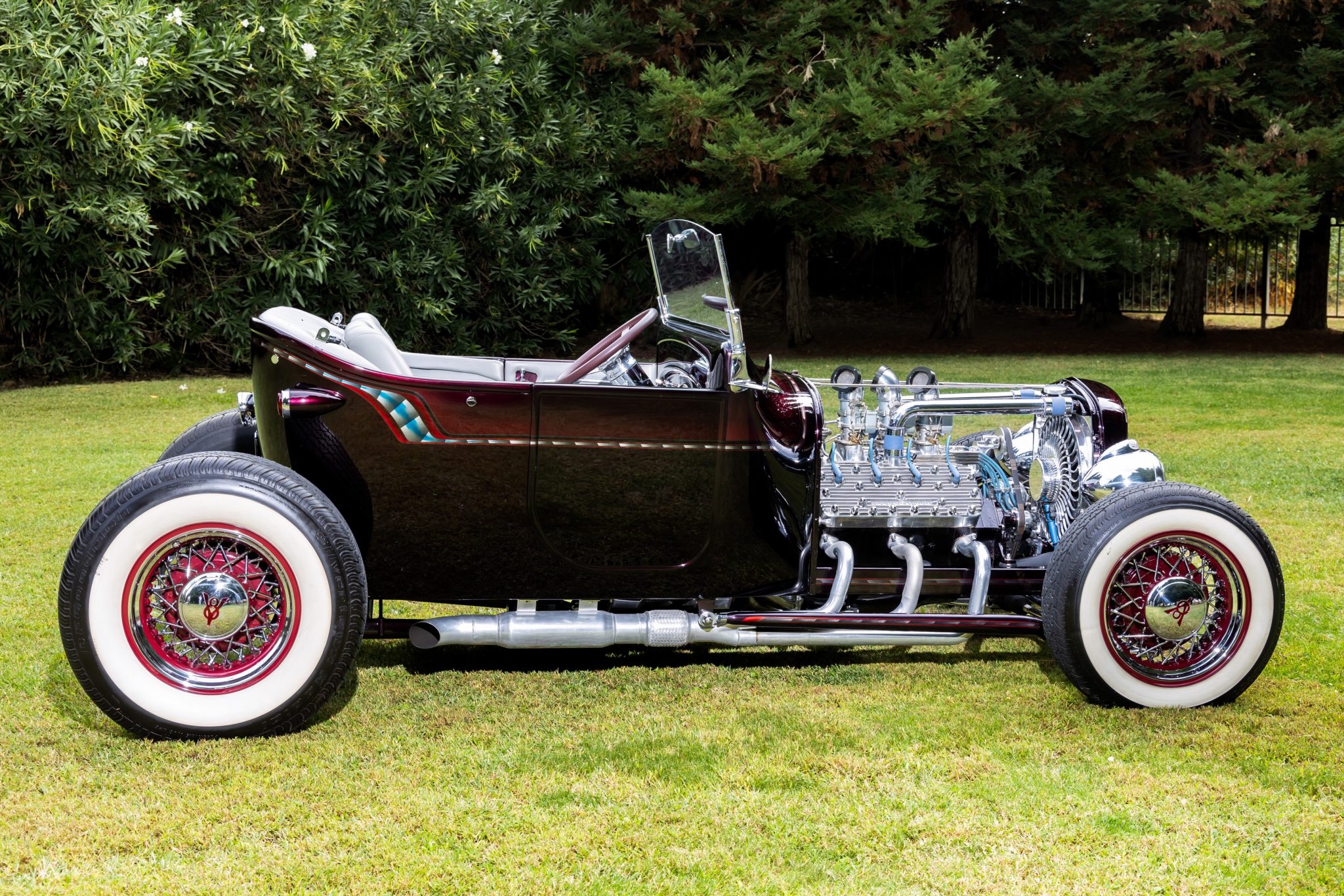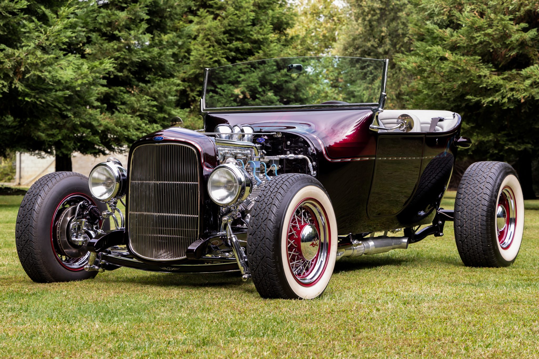 Wheel Vintiques 15″ wire wheels have chrome-finished spokes, red hubs and rims, and chrome hubcaps and inner and outer trim rings. BFGoodrich Silvertown Radial whitewall tires measure 165/70 at the front and 255/70 out back. Braking is provided by ventilated discs at each corner and a dual-reservoir master cylinder housed beneath the dashboard. The I-beam front axle has been dropped 4″ and works in conjunction with a Unisteer rack-and-pinion steering system, Pete & Jake’s Hot Rod Parts front shocks, and a transverse spring. The rear suspension is a custom multi-link setup with coilovers.