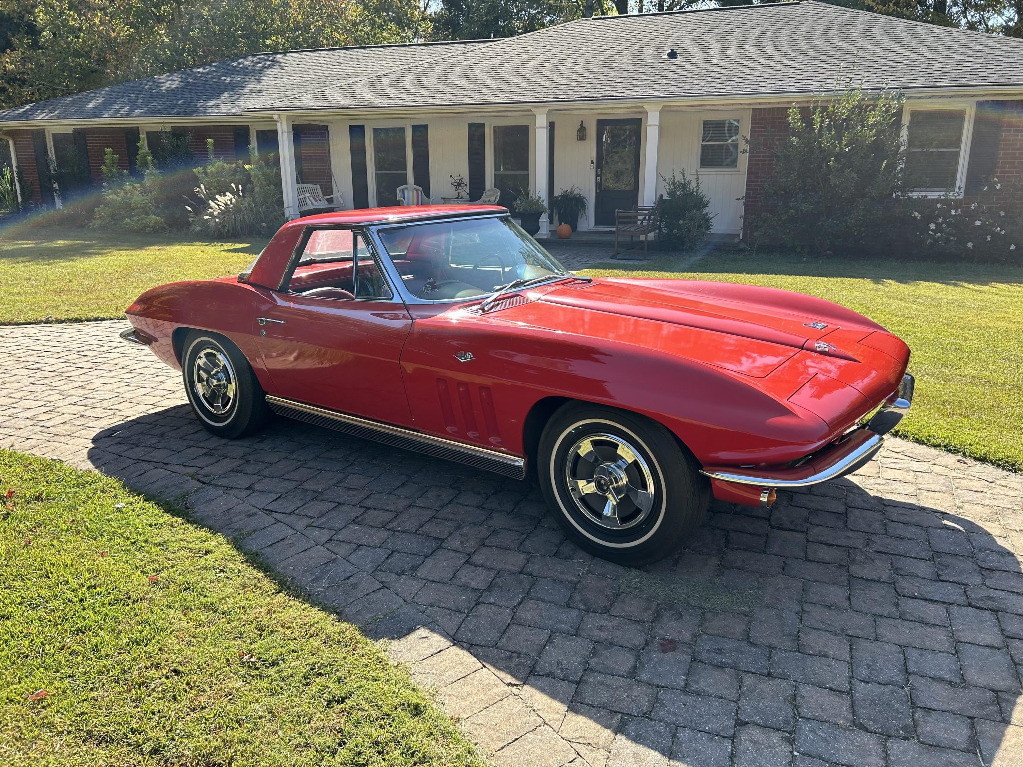 The 15″ steel wheels wear faux-knock-off covers and are mounted with F78-15 Goodyear tires. The C2 was the first Corvette to offer fully independent suspension, with upper and lower control arms at the front and a three-link setup with a transverse leaf spring at the rear. The shocks were replaced in 2018, and a Borgeson power steering conversion kit was installed in 2022. Braking is handled by four-wheel discs, and the front pads and the right front caliper were replaced in 2021.