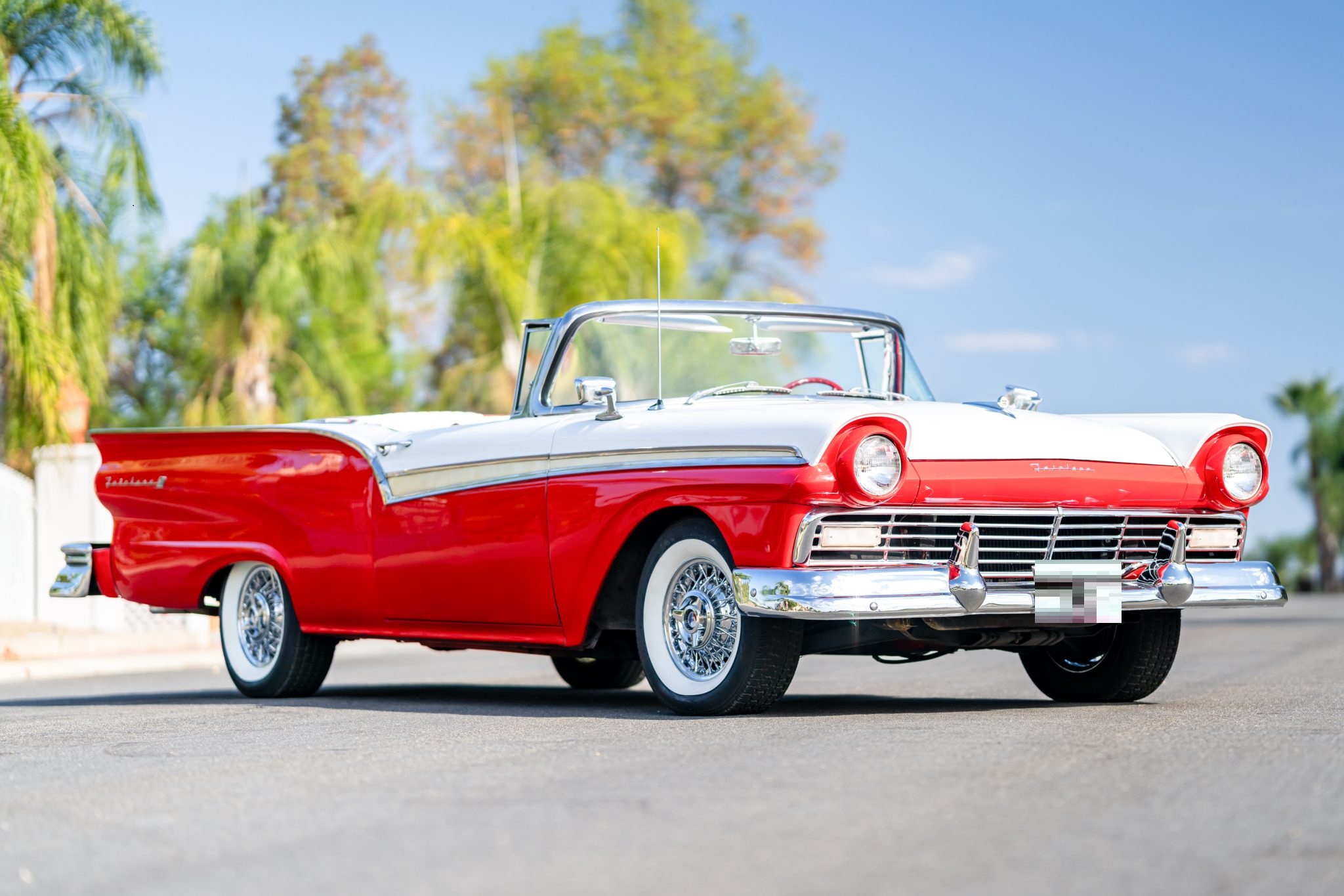 The 14″ chrome spoke wheels are mounted with American Classic radial tires measuring 215/75. The car is equipped with power steering, and braking is provided by power-assisted drums at each corner.