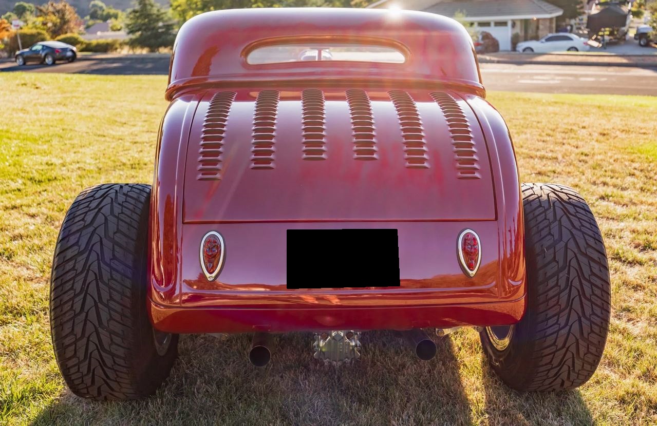 The color-matched frame is constructed with Just-A-Hobby deuce rails that have been pinched at the front. The suspension features a Mor-Drop axle, single radius rods, and rack-and-pinion steering rack up front, while a four-link rear setup with adjustable coilovers has been fitted at the rear.