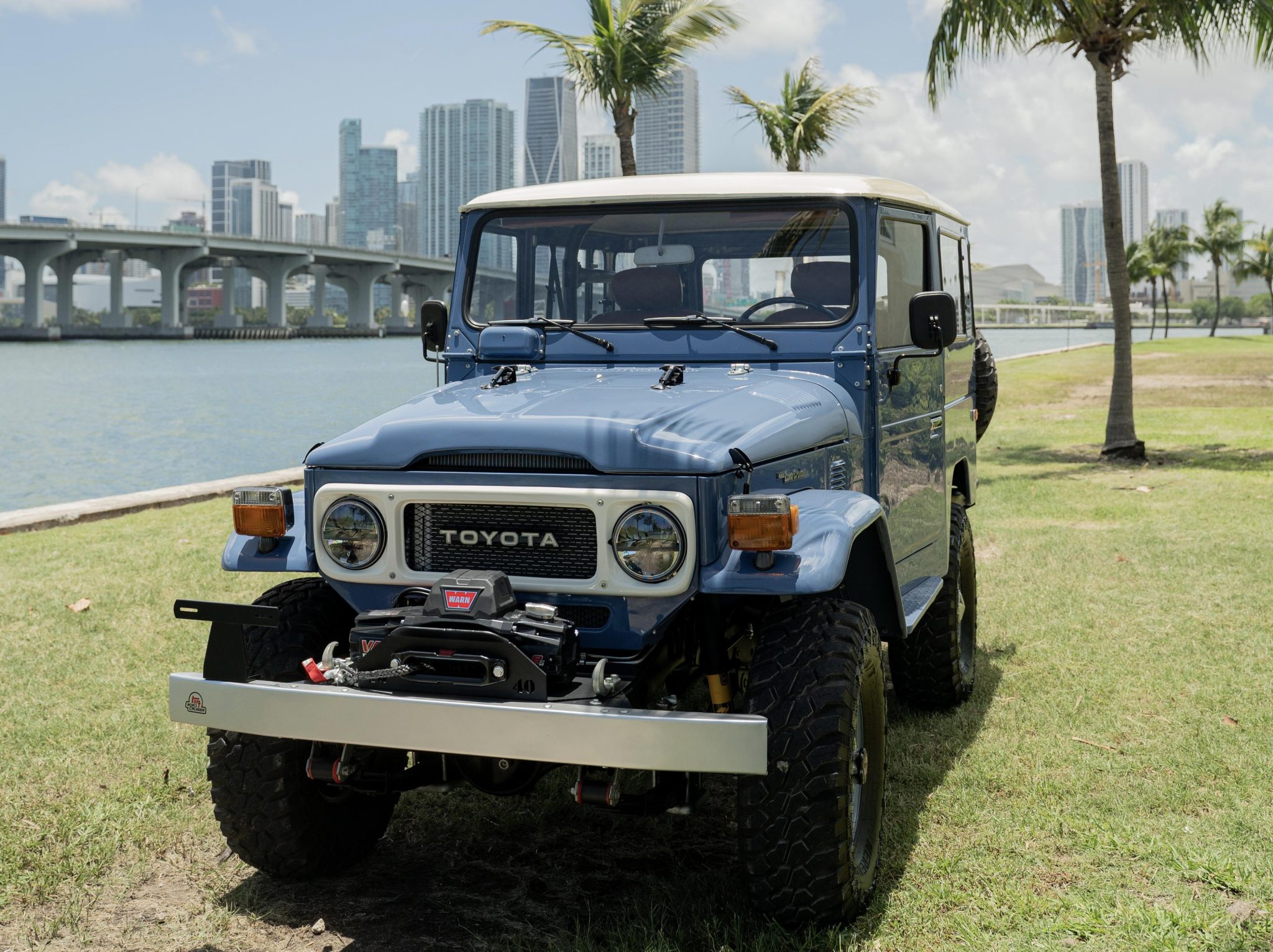 The 15″ steel wheels with polished hubcaps are mounted with 33×12.5″ Nereus NS523 M/T tires, and a matching spare is affixed to the swing-away tire carrier. The truck is equipped with manually locking front hubs, power steering, and an Old Man Emu steering stabilizer and shock absorbers. The front disc and rear drum brakes were overhauled and the master cylinder and booster were replaced under current ownership.