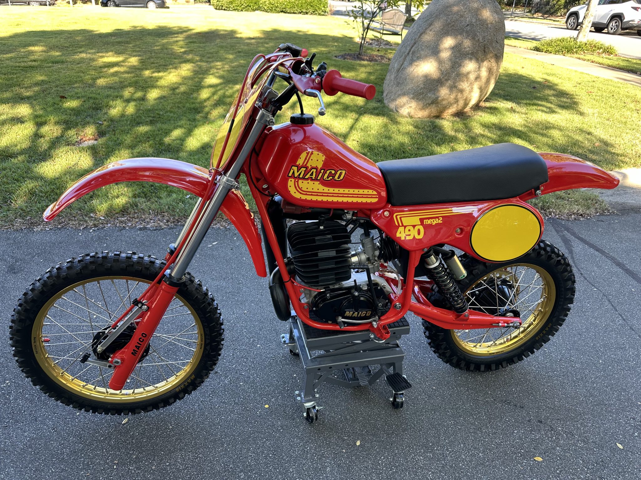 Gold-finished 21″ front and 18″ rear alloy rims are laced to drum-brake hubs and wear Maxxis knobby tires. Suspension consists of a conventional leading-axle fork with red-finished lowers as well as dual piggyback shocks mounted to the swingarm.