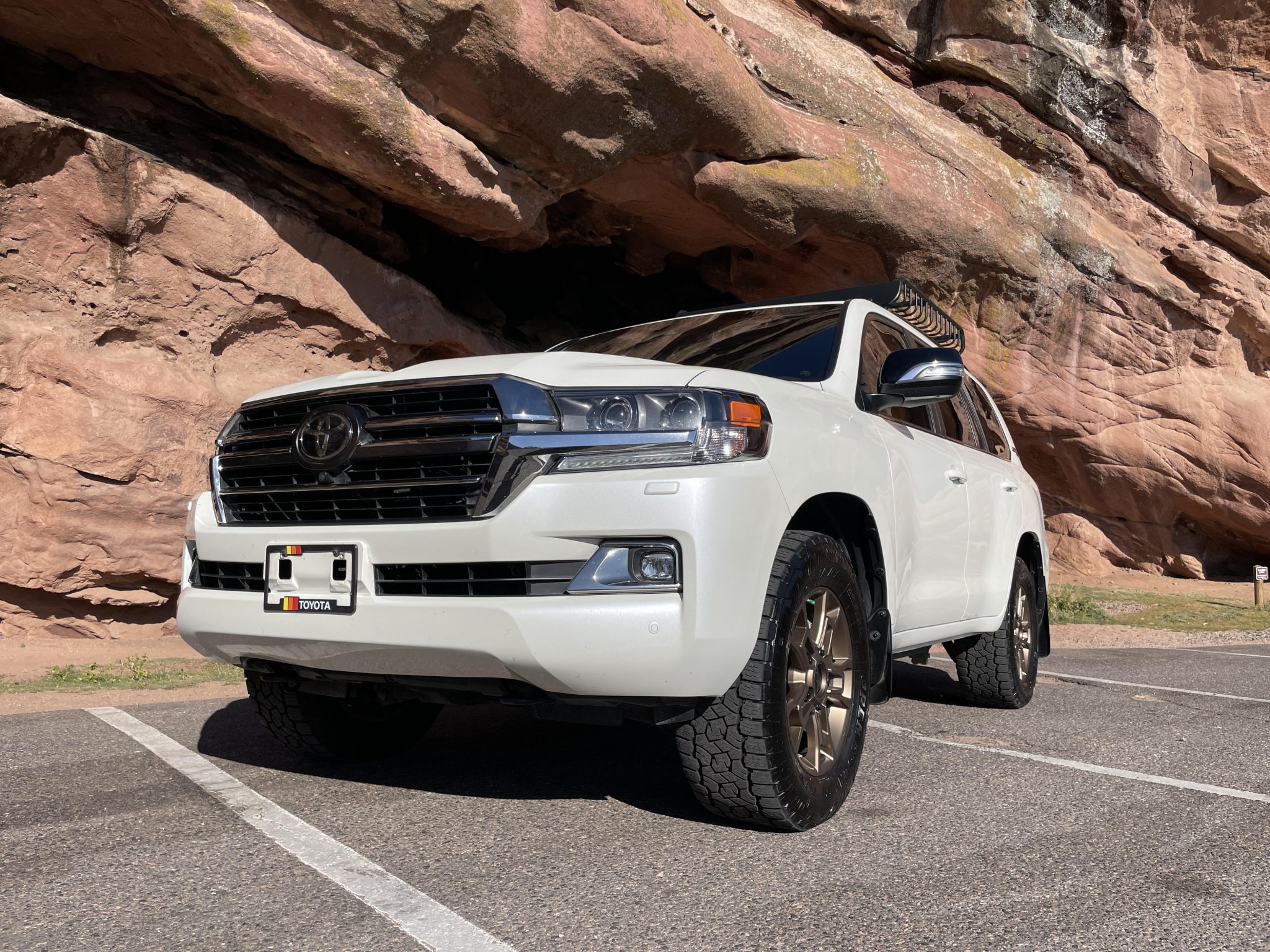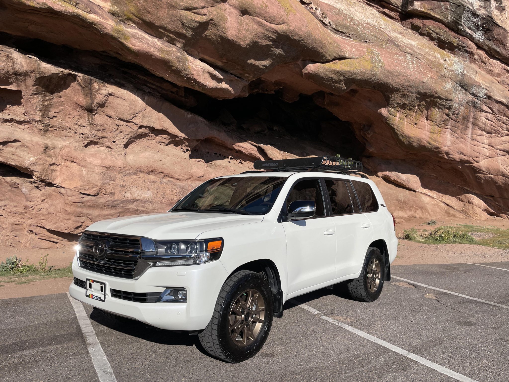 Bronze-finished 18″ BBS forged aluminum alloy wheels are mounted with 285/60 Toyo Open Country A/T tires. Braking is provided by ventilated discs at each corner. Skid plates cover the front suspension, radiator, fuel tank, and transfer case, and the truck came factory equipped with a Kinetic Dynamic Suspension System (KDSS), Crawl Control, Brake Assist, and Active Traction Control. The power steering fluid was changed in July 2024.