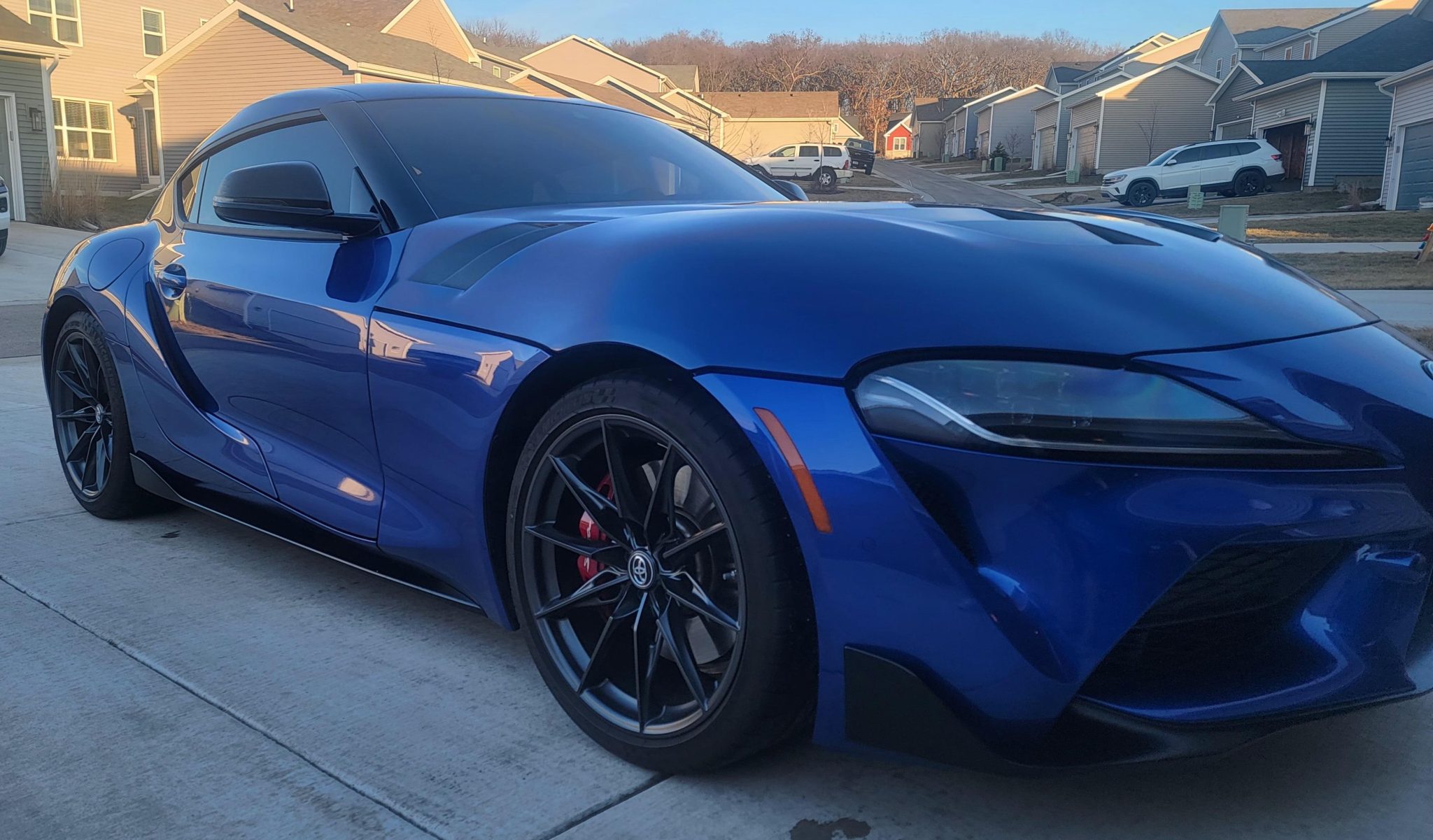 Black-finished 19″ forged aluminum wheels are wrapped in staggered-width Michelin Pilot Super Sport tires. The car rides on an Adaptive Variable Suspension (AVS) system and stopping power is provided by four-wheel disc brakes with Supra-branded Brembo four-piston front calipers.