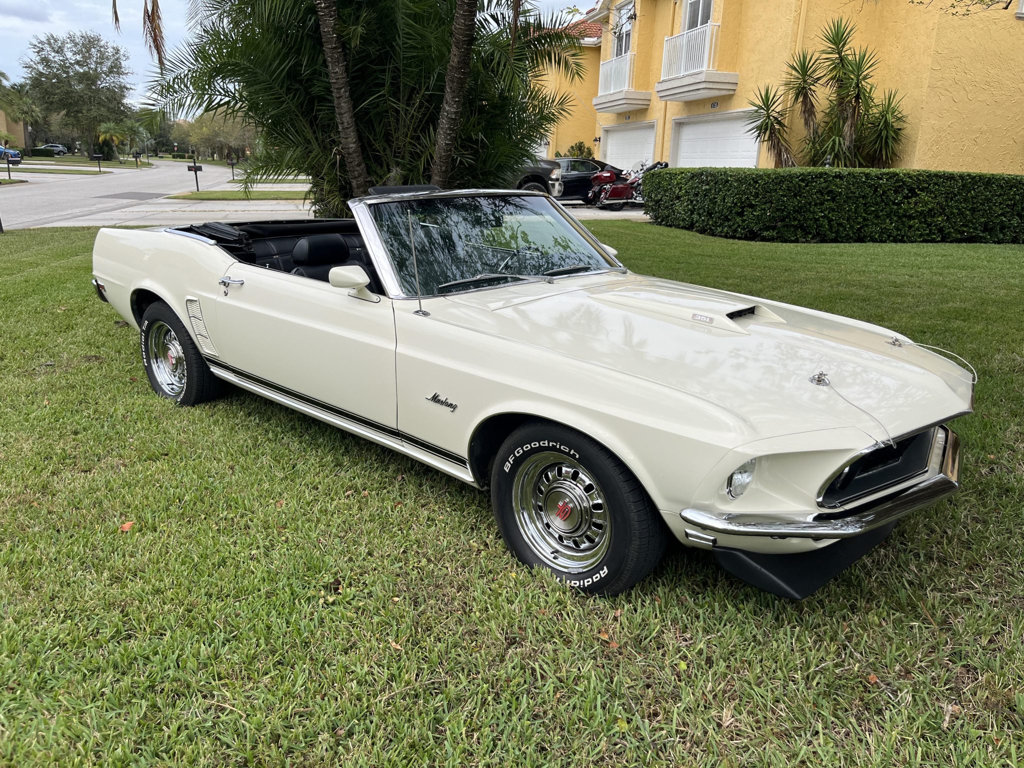 The 15” styled steel wheels have GT center caps and are mounted with BFGoodrich Radial T/A raised white letter tires. The car is equipped with power steering, and braking is handled by power-assisted front discs and rear drums. The seller states that the control arms were lowered 1″.
