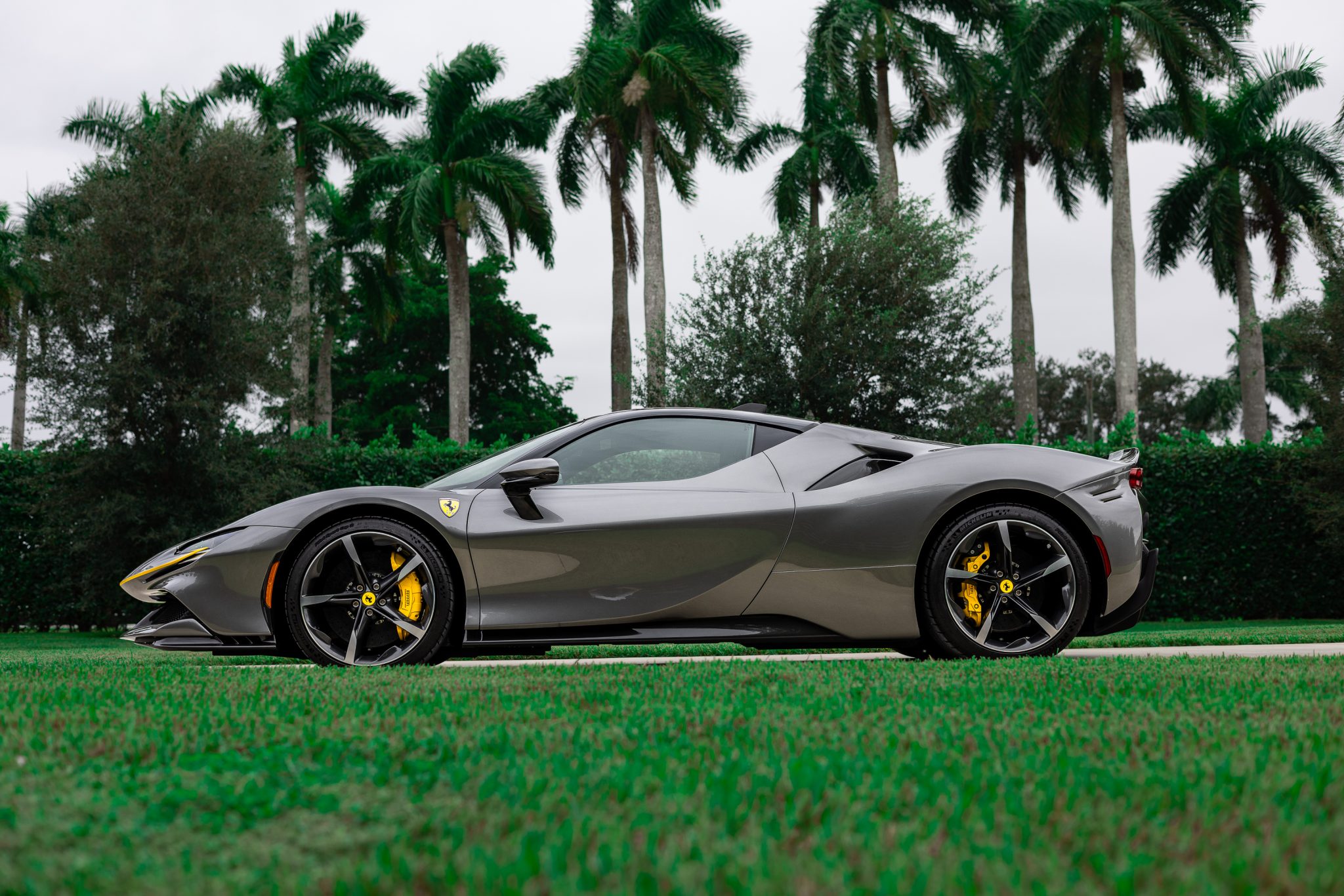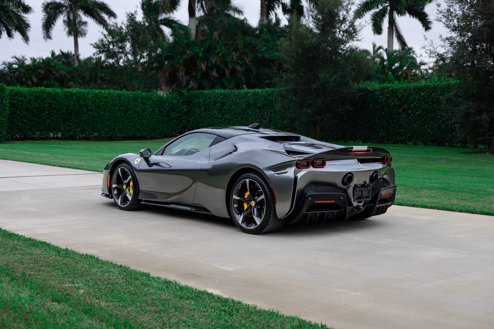 Forged 20″ wheels featuring diamond-finished accents are mounted with Michelin Pilot Sport Cup 2 tires measure 255/35 up front and 315/30 out back, and they are secured with titanium wheel stud bolts. The SF90 Stradale features an aluminum chassis, and Multimatic-sourced shocks and titanium springs were included as part of the Assetto Fiorano package. The electronic Side Slip Control (eSSC) and electric traction control (eTC) systems distribute torque to each individual wheel. The regenerative brake system splits stopping force between the hydraulic system and the electric motors. Yellow-finished calipers over carbon-ceramic rotors are fitted at all four corners. A brake fluid flush was performed in July 2023.
