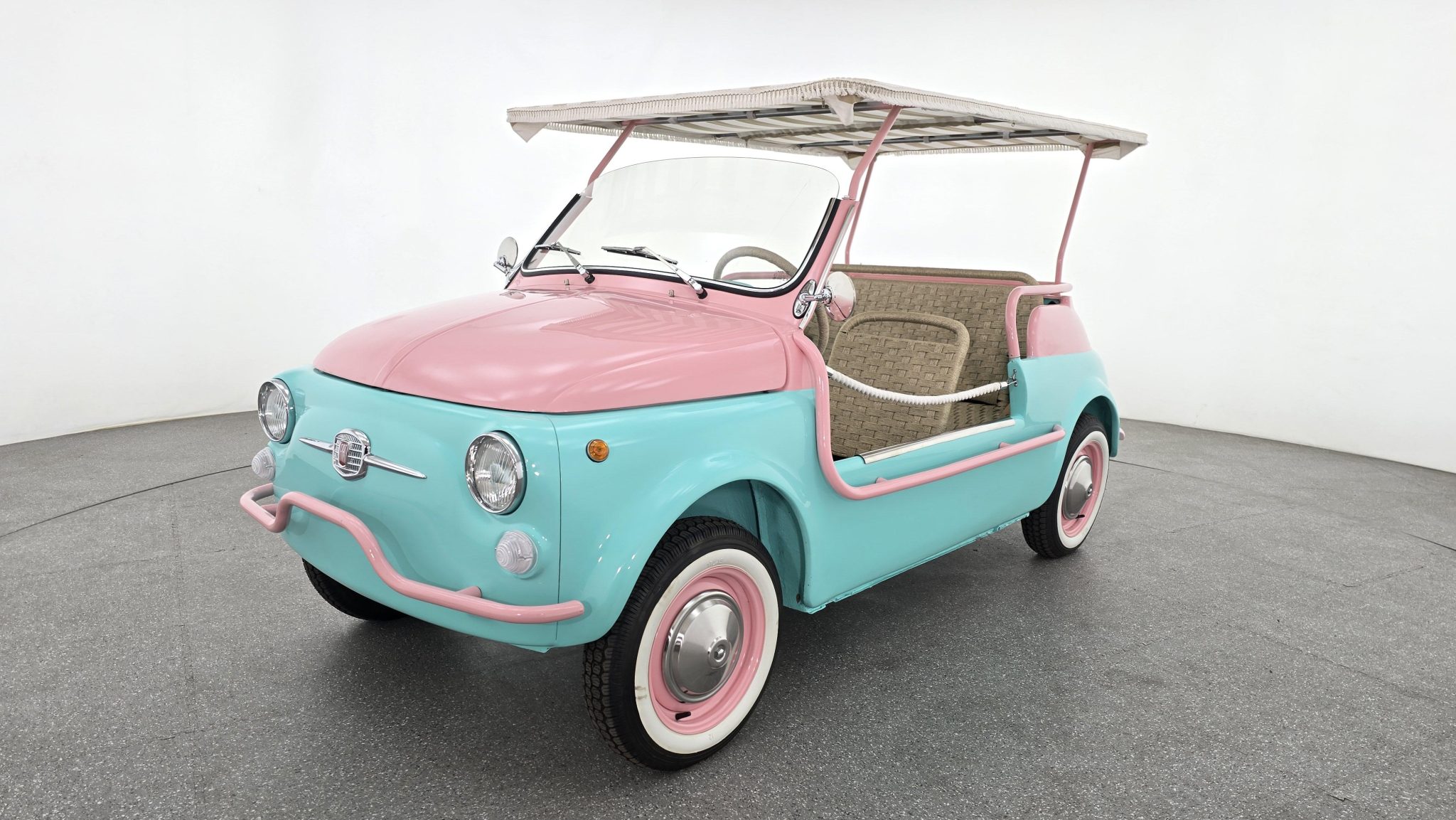The 12″ wheels have bright covers, while the Deestone tires are trimmed with whitewall inserts, and a matching spare is stored in the front trunk. Replacement brake hoses, drums, shoes, and wheel cylinders are noted.