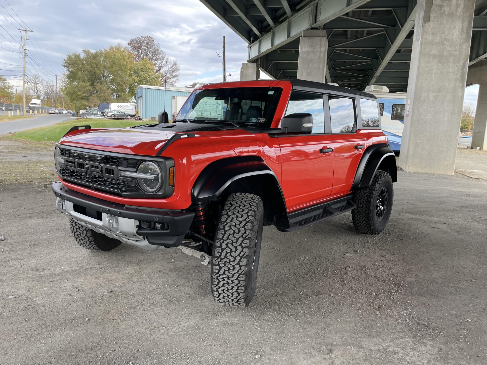 The 17″ V-spoke alloy wheels are mounted with BFGoodrich Baja Champion tires measuring 37×12.5″ and a matching spare is mounted to the reinforced swing-out tailgate. The truck is equipped with a Raptor High-Performance Off-Road Stability Suspension (HOSS) system with live-valve Fox dampers, a Terrain Management System with seven selectable “Goes Over Any Type of Terrain” (G.O.A.T.) drive modes, and a front stabilizer bar disconnect system. Stopping power comes from four-wheel anti-lock disc brakes with dual-piston floating calipers over 350mm rotors up front. The Raptor features a wider track and increased ground clearance over the standard Bronco.