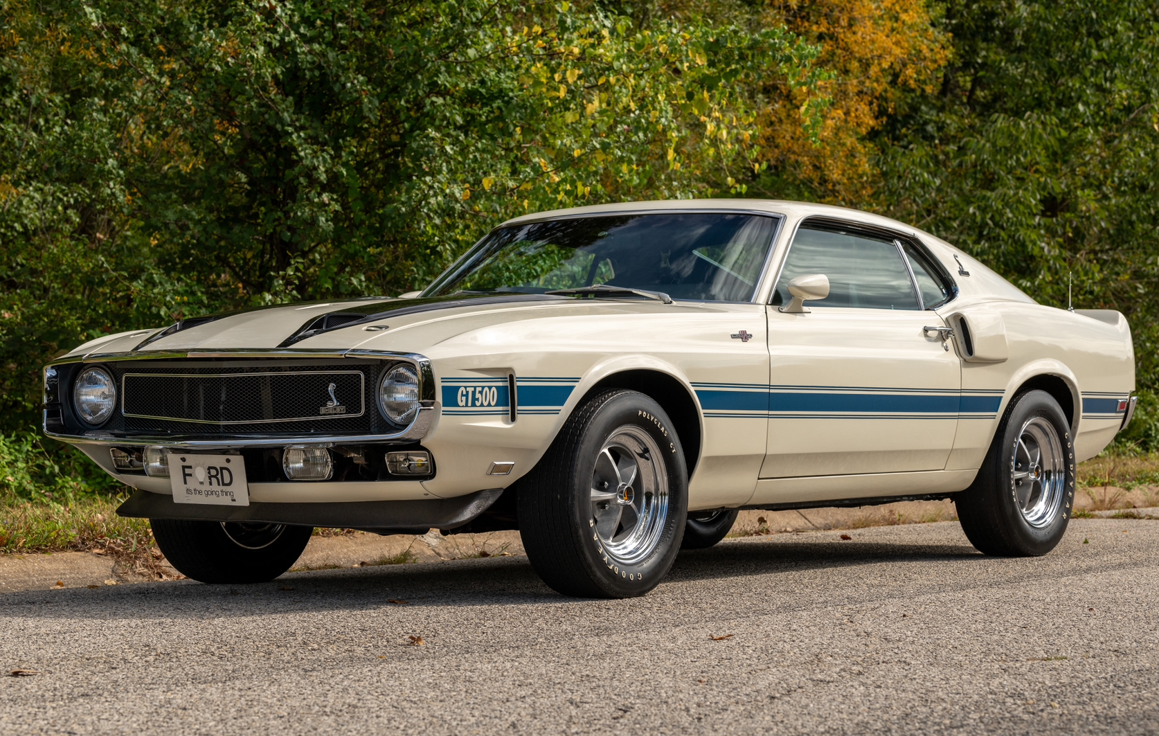 Gray 15″ five-spoke Shelby wheels feature polished lips and black Shelby center caps, and they are mounted with an older set of F60-15 Goodyear Polyglas tires. The car is equipped with power steering, and stopping power is provided by power-assisted front discs and rear drums.