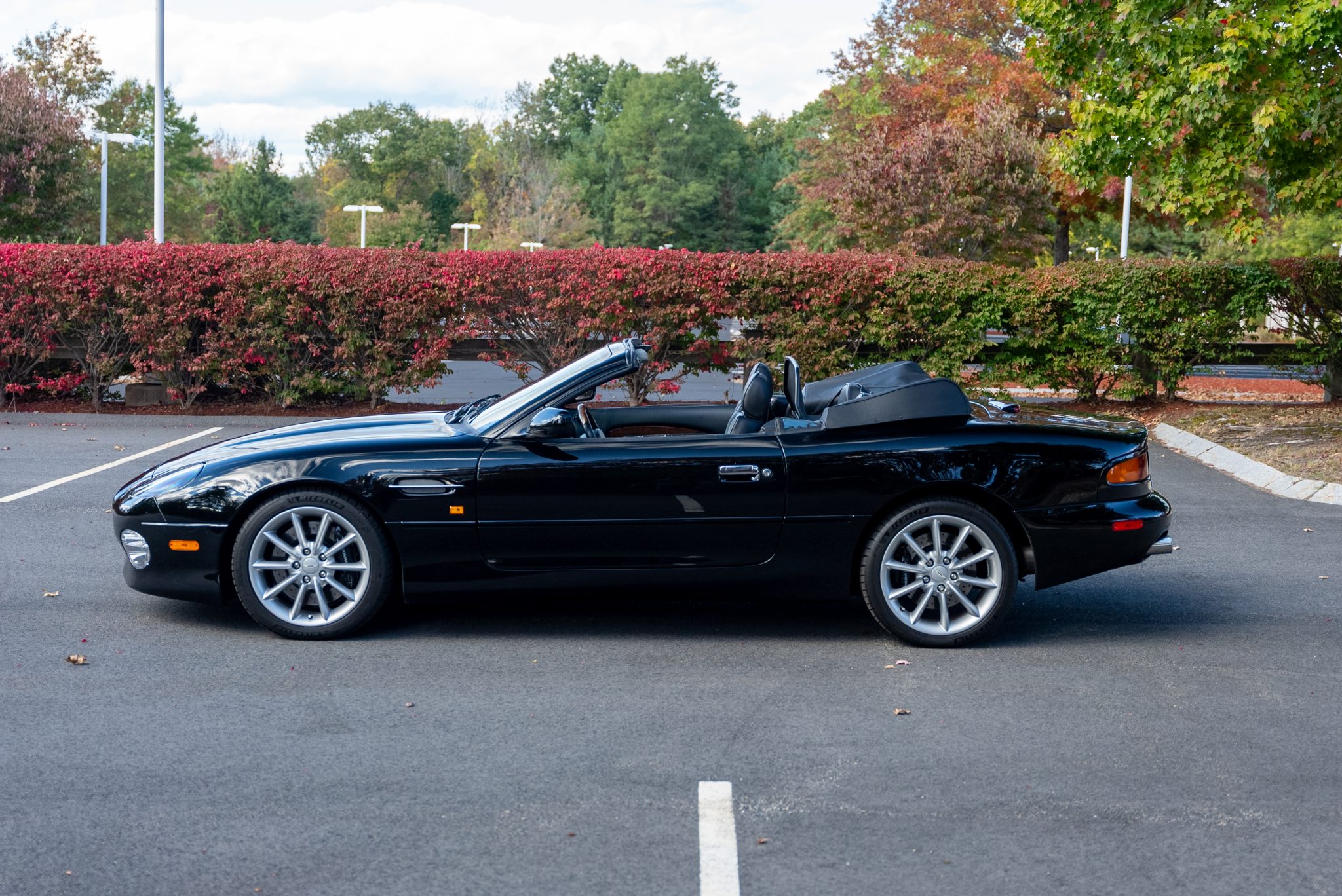 Silver-finished 18″ 10-spoke alloy wheels are mounted with Michelin Pilot Sport 4S tires measuring 245/40 up front and 265/35 out back. Stopping power is provided by black Aston Martin-branded calipers over cross-drilled discs at each corner.
