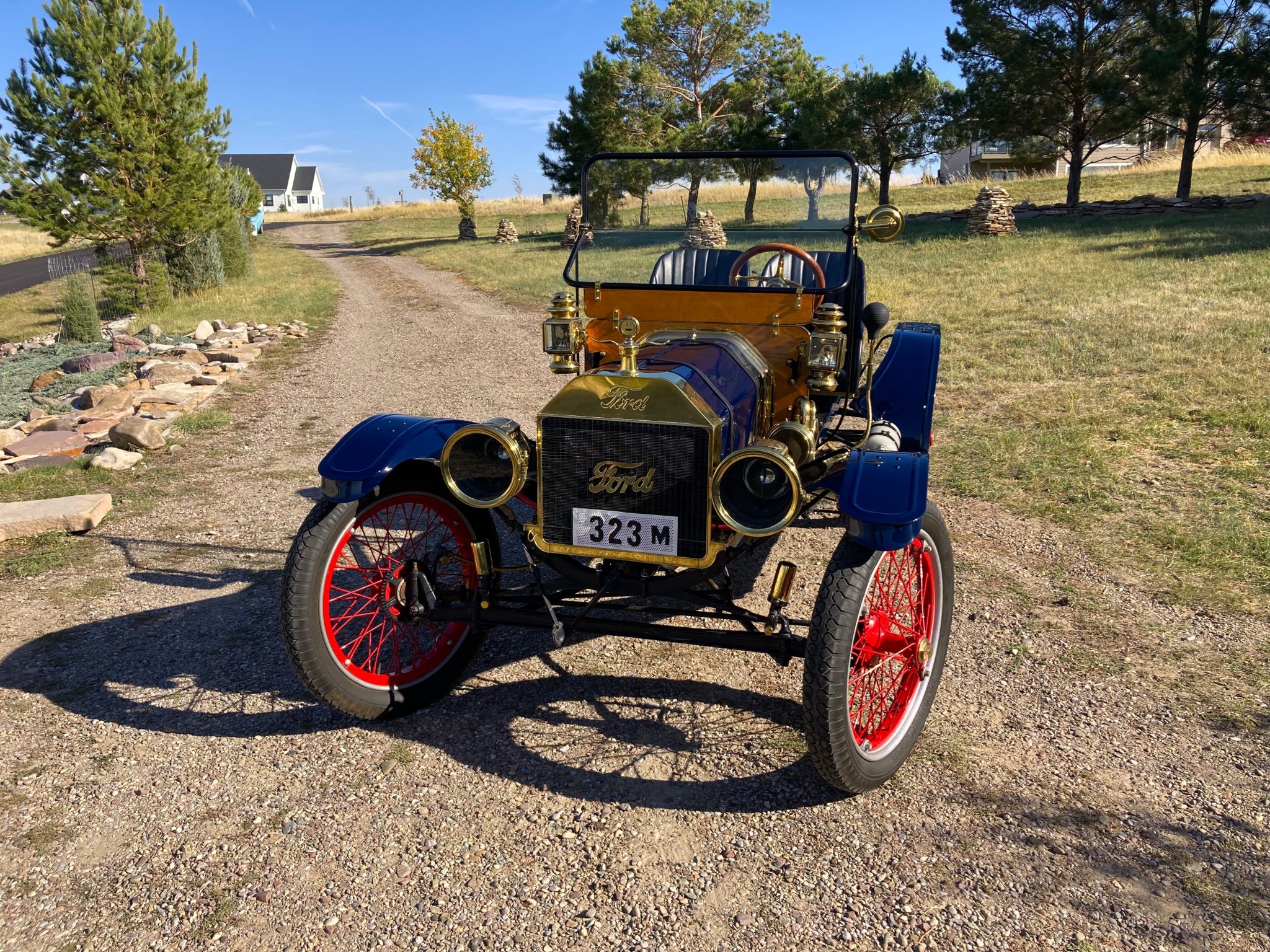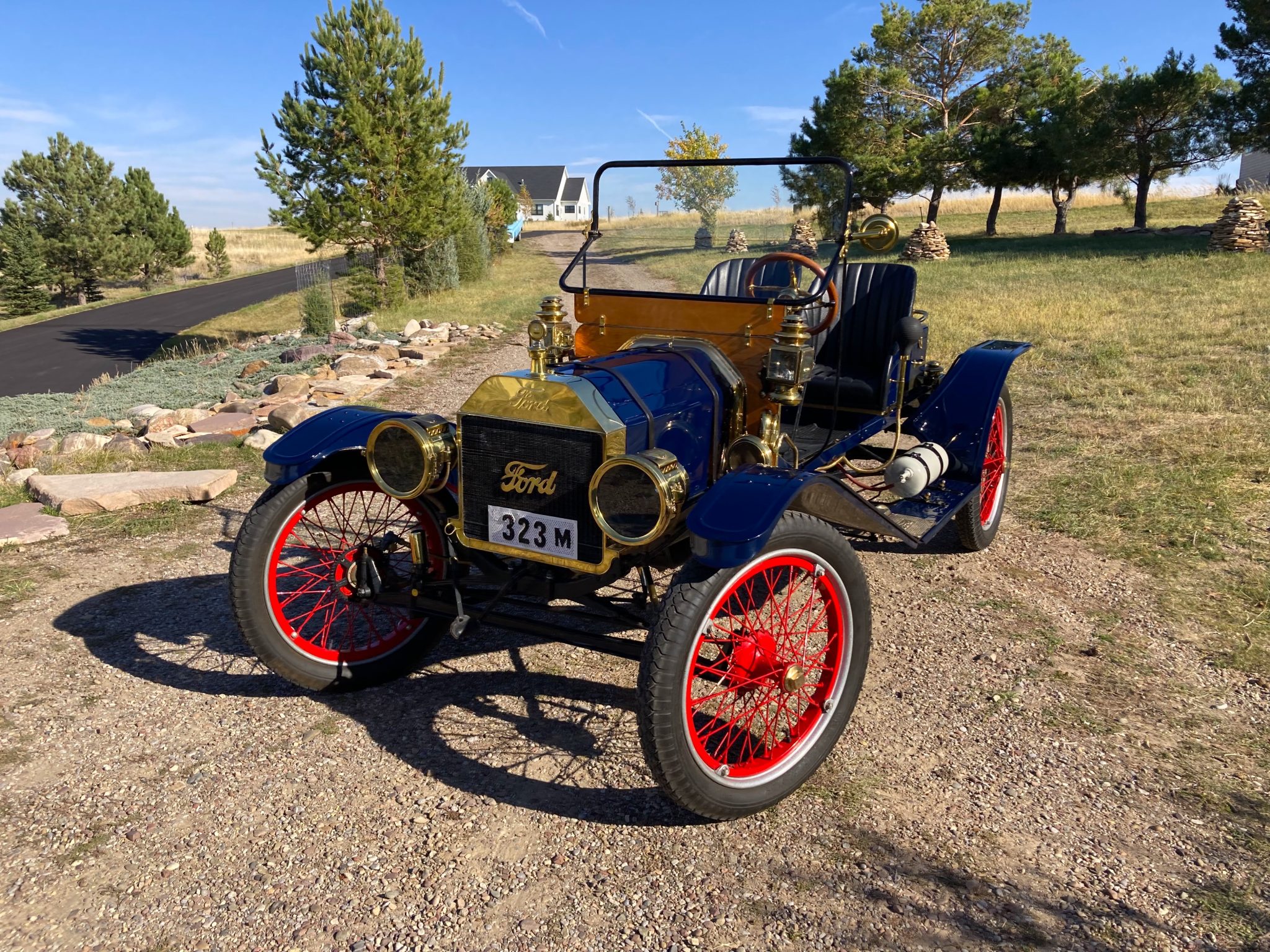 Red-painted Hayes demountable wire wheels are mounted with silver rims and 30×3½ Ward’s Riverside bias-ply tires. The frame was repainted black during the build and features a front and rear transverse leaf spring suspension. The front brass shock absorber internals have been removed. Stopping power is provided by AC rear mechanical drum brakes.