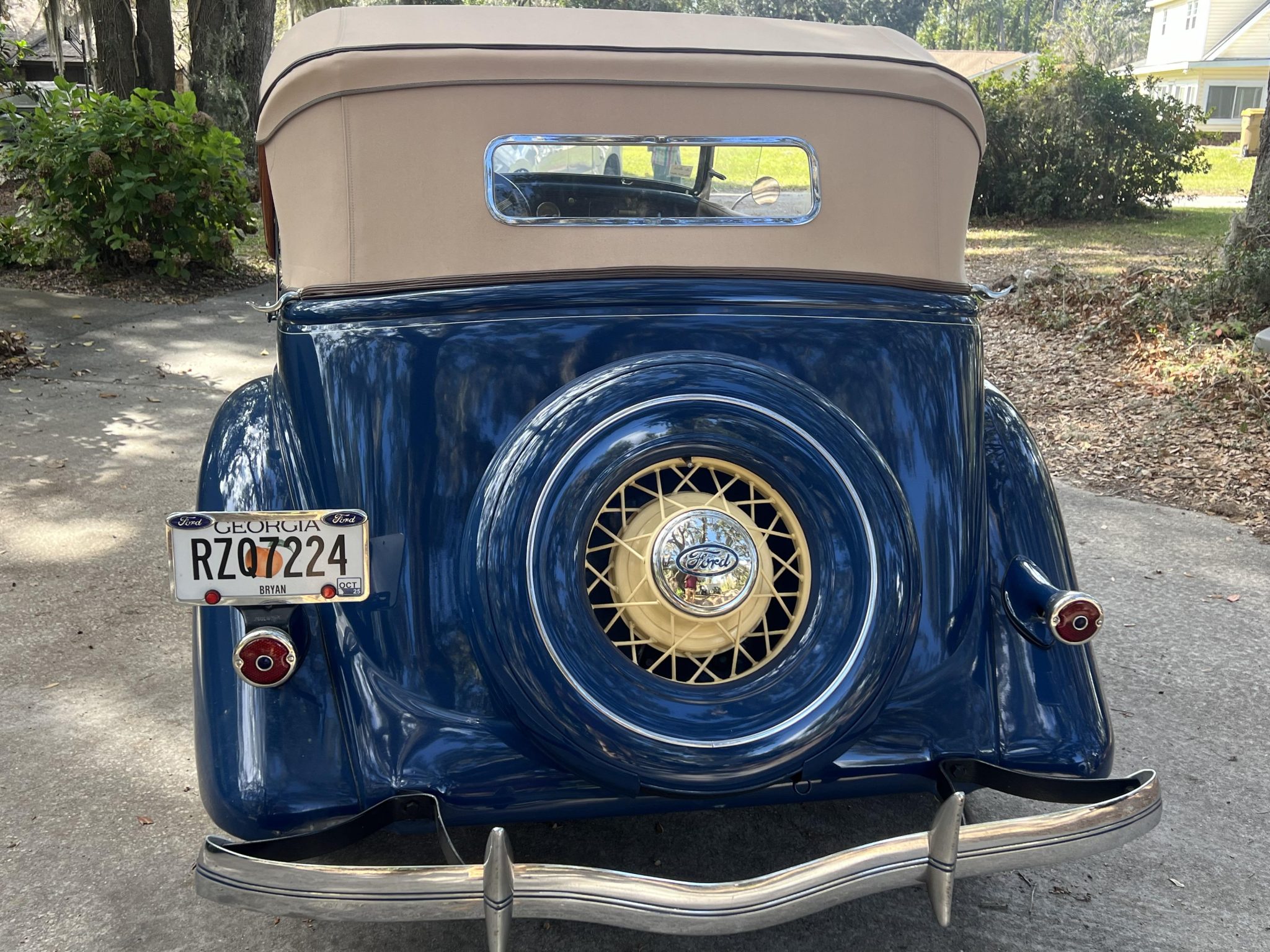 Cream-color 16″ wire wheels are mounted with 6.00-16 Firestone Deluxe Champion wide-whitewall tires. Braking is provided by hydraulic drums at each corner. A body-color spare tire carrier is affixed to the rear of the car. The left-rear shock requires replacement.